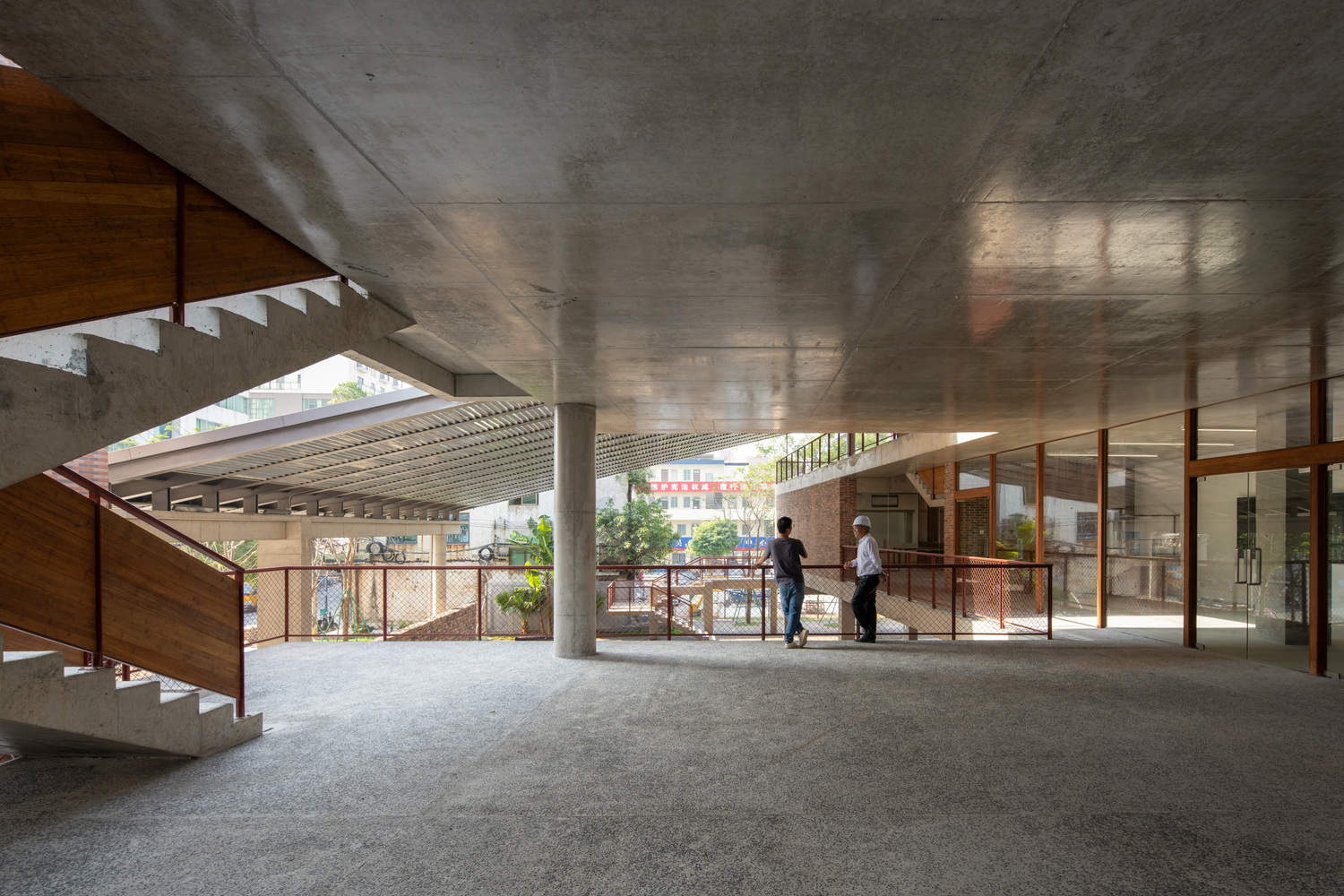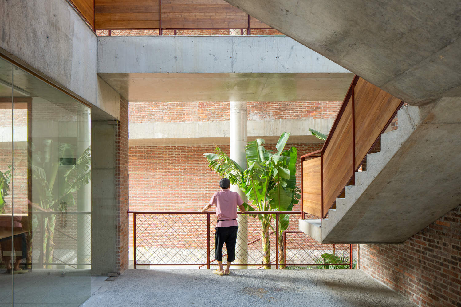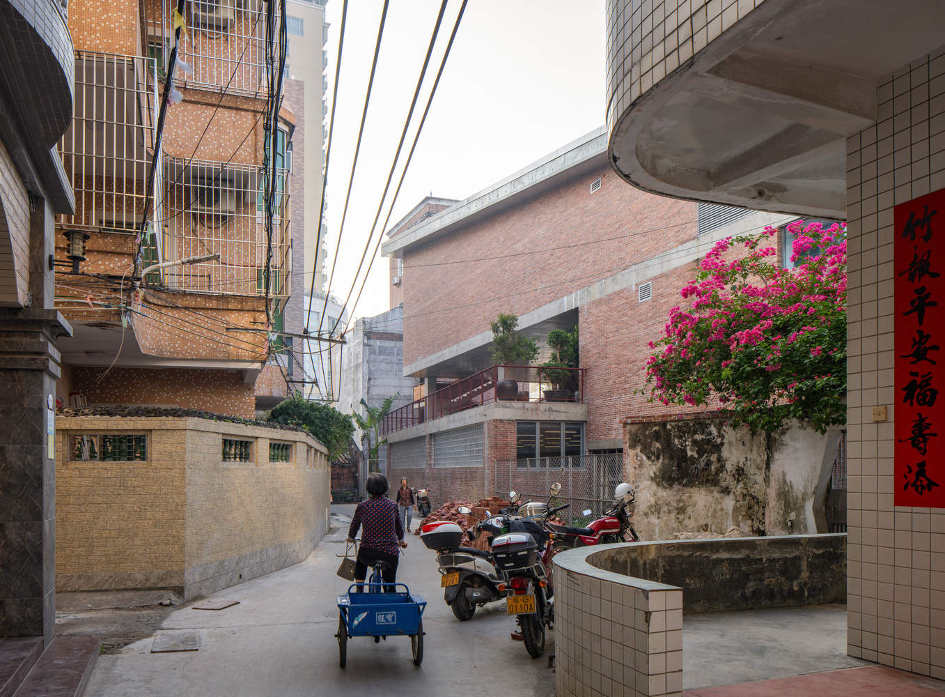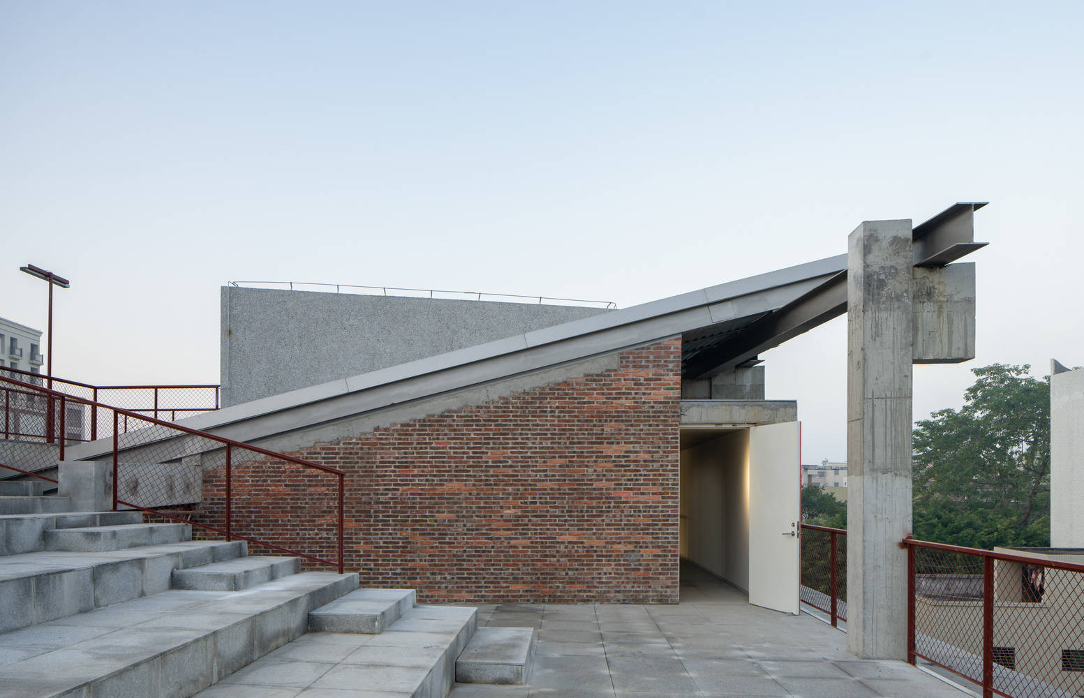 To maintain harmony with the local environment, the construction employs familiar materials such as red brick, washed terrazzo, tiles, and galvanized steel plates. Economic considerations are integral to the project: the profiled galvanized steel plates used in the ceiling also serve as the roofing surface, reducing scaffolding costs, while the bluestone slate tiles come from leftover materials from landscaping projects. These "low-tech" construction methods not only preserve the texture of traditional dwellings but also enhance the public character of contemporary rural life.