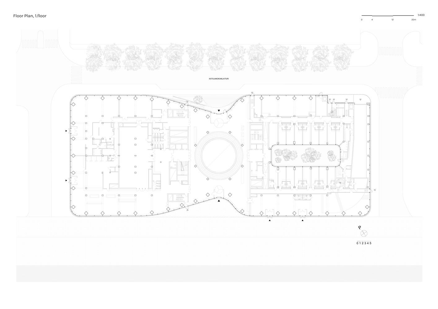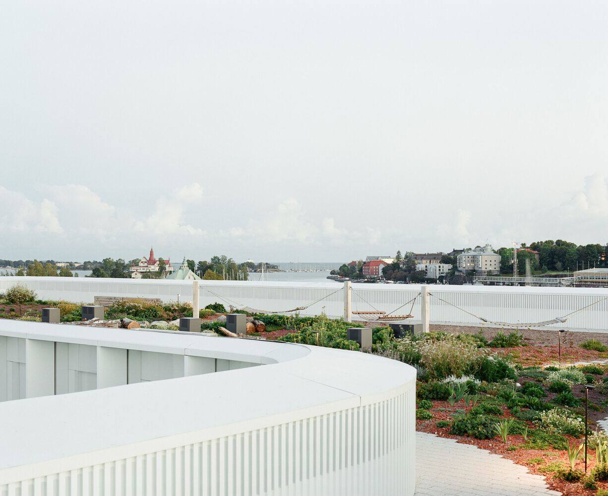 城市文脉的巧妙回应与创新:项目在城市文脉的融入上展现了建筑师的匠心独运。它位于具有历史意义的卡塔亚诺卡滨水区,设计在延续赫尔辛基新古典主义城市轮廓的同时,通过立面蜿蜒的形态打破了建筑的体量感,实现了与周围建筑的多样化和层次感的和谐统一。项目不仅将滨水区过渡为一个开放的城市公共空间,还通过立面材料的选择和室外空间的设计,将建筑与周围环境紧密联系,例如立面采用的Viitasaari灰色花岗岩,以及庭院中的桦树林和屋顶上的群岛草地,都体现了对场地文脉的尊重和对自然元素的巧妙运用,提升了建筑的整体品质。