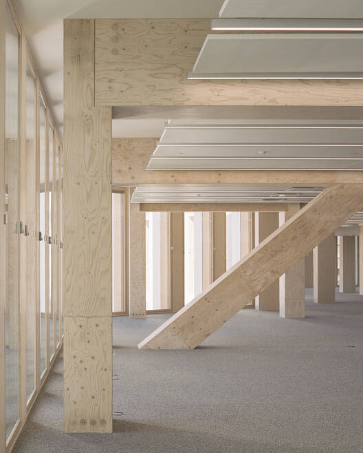 该项目的目标是在较长的生命周期内尽量减少气候影响,并充分利用可再生资源和材料。该建筑的地上结构采用标准的工业预制斯道拉恩索大型木制品,为开创性的结构和建筑解决方案量身定制。柱梁框架和立面结构由芬兰瓦尔考斯生产的层压单板木材(LVL)制成。加强结构的内墙、电梯井和楼梯井,以及地板和屋顶结构,均由瑞典Gruvön生产的交叉层压木材(CLT)制成。整个框架由7600立方米的云杉和2500个木质构件组成。