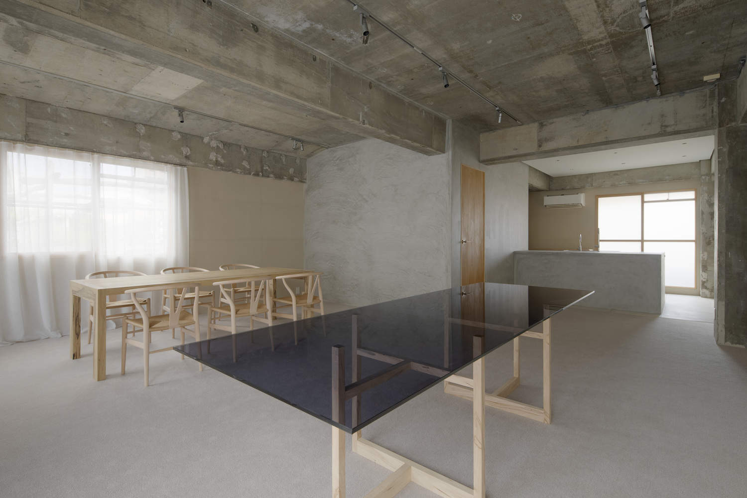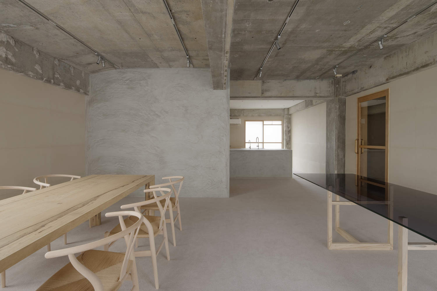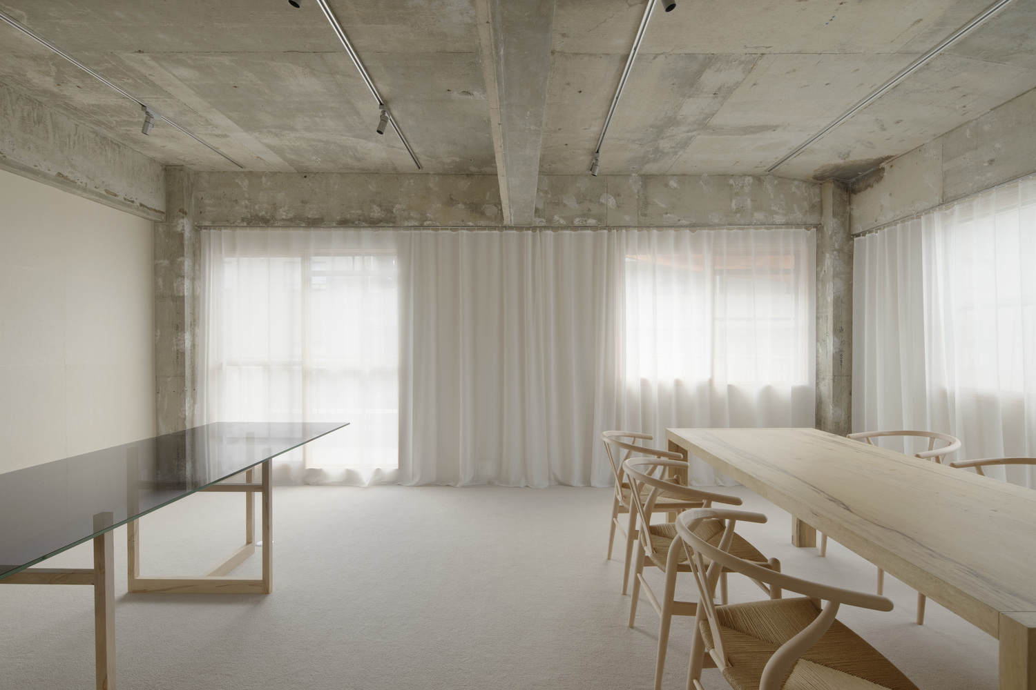The spatial design avoids partitions, allowing natural light to softly diffuse through curtains and fill the entire area. To facilitate exhibitions and events, the walls are thoughtfully prepared for practical use, while washi paper gently diffuses light, and carpeted floors provide warmth underfoot. The building's 45-year-old structure has been intentionally preserved, celebrating its natural aging and imperfections as integral elements of the design. Rather than concealing the wear of time, we embraced its patina and texture to evoke a sense of authenticity and timeless character. We hope this space will add new color and richness to the lives and hearts of all who visit.
