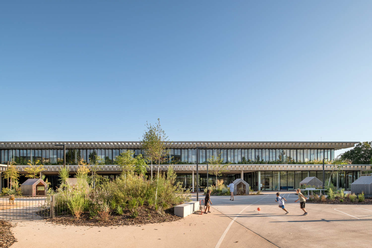 All around the plot, an array of planted embankments hugging the slope of the terrain serves as the base for the building. These rises form a natural separation between public space and the classrooms and playgrounds. The plantings continue along all the facades of the building, on the ground floor, the upper level and even the roof, which is treated as a 'fifth facade,' providing all the areas of the school with a green foreground. The project's aesthetic is assertively mineral and its language very horizontal, accentuated by the wide roof overhang providing protection from the sun and sheltering the forecourt. The school's glass façade fits under this overhang, with vertical spines echoing its rhythmic pattern. On the playground side, the planted banks and overhang give way to a full-height open façade punctuated by columns and sheltered by a slatted concrete awning.