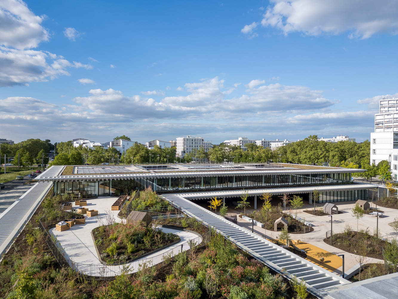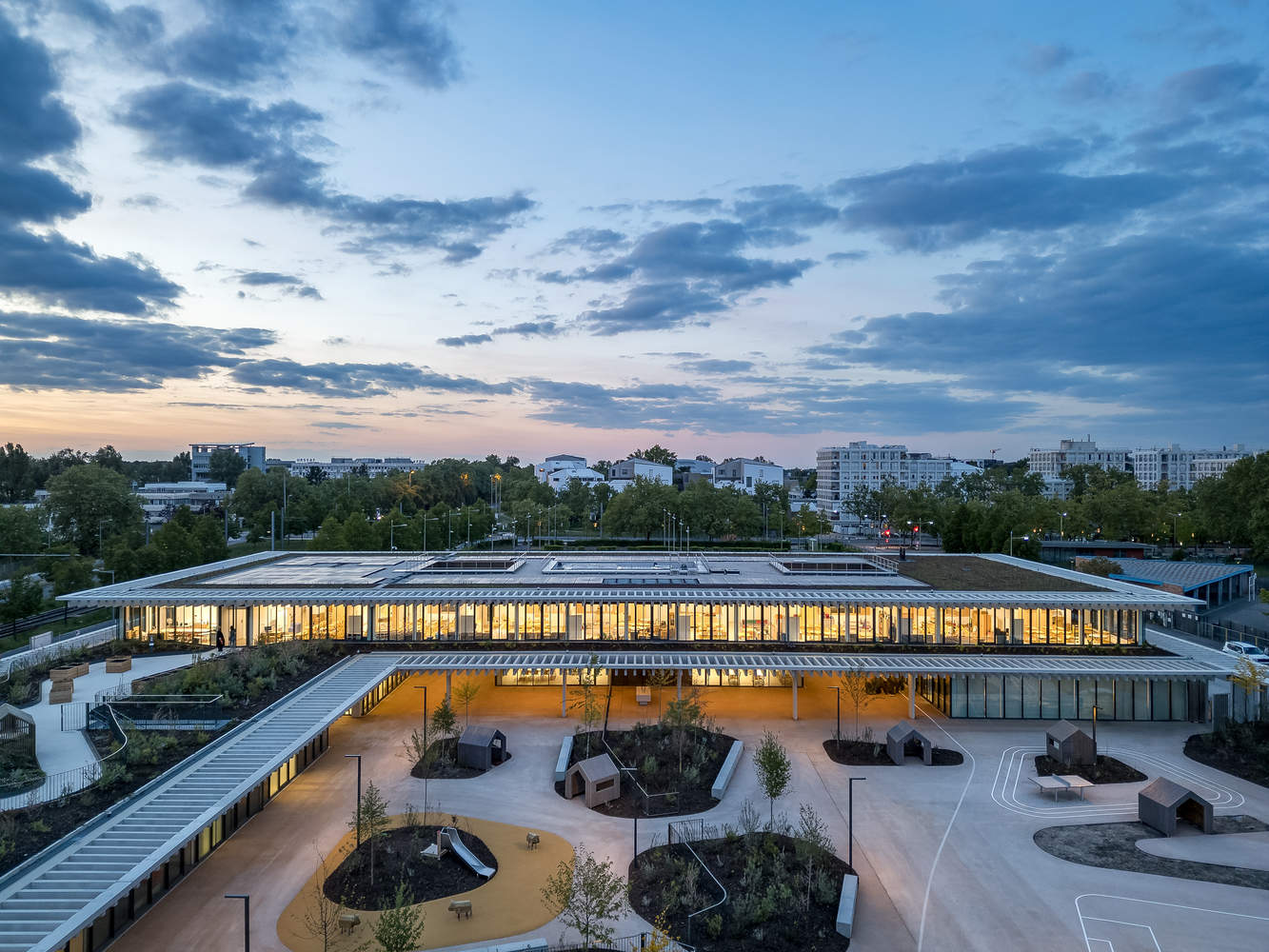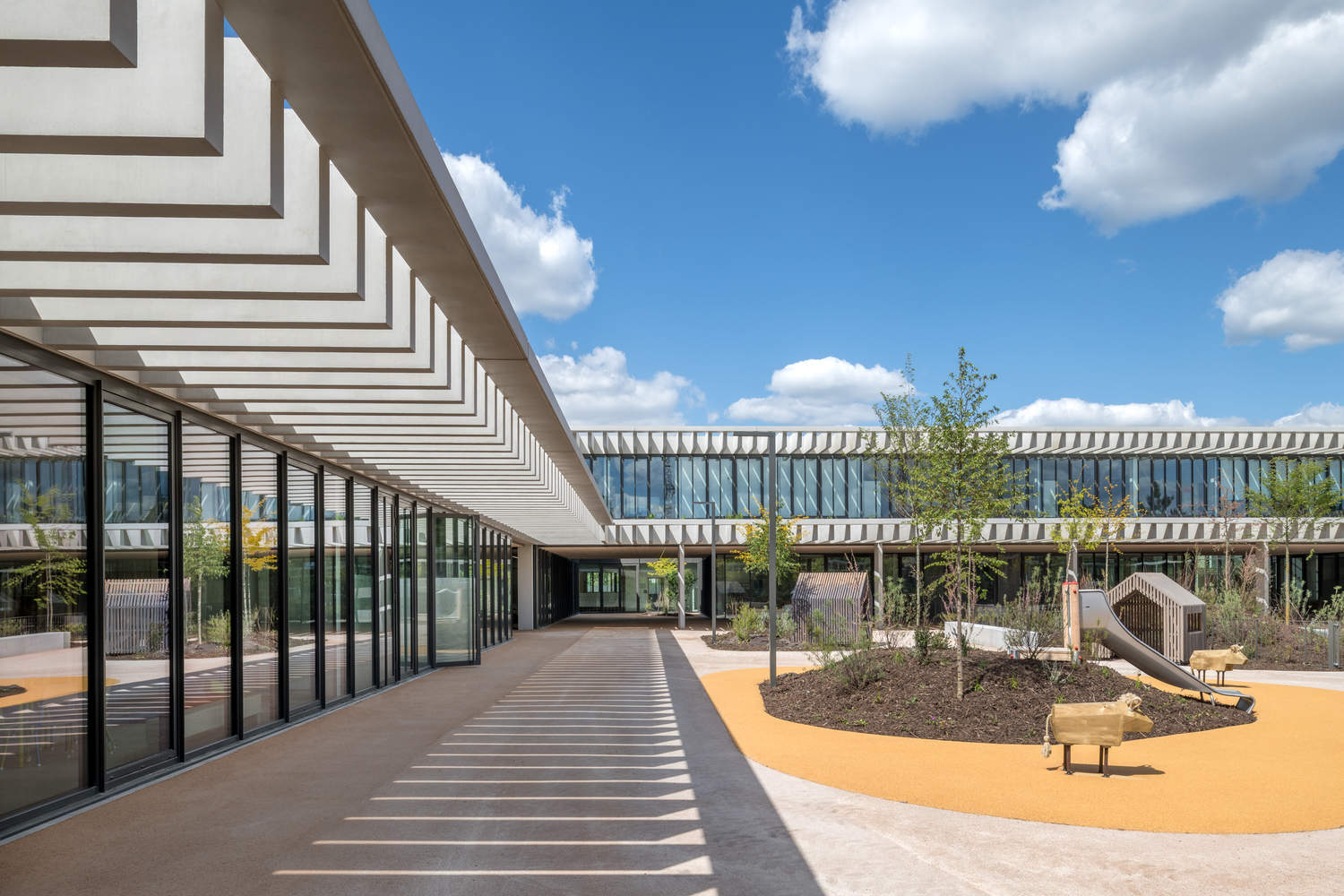 The ground floor and first floor rise in stepped formation. The ground-level west wing of the building houses the nursery school and opens onto the playground. Its planted roof, defined by a pattern of mounds and topographical features that create differentiated spaces laid out playfully, offers students a real garden near the primary school classrooms. The north wing is on two levels. The ground floor houses part of the nursery school, the canteen and the administrative, multi-use and extracurricular areas of the primary school, while the upper level houses the primary school classrooms. The interior spaces are arranged around two patios which bring in natural sunlight and brighten the circulation areas. Each school has its playground, dotted with trees, plants, cork-floored play areas and benches. Special care has been taken over the design of the boundary between the two playgrounds. Treated as a continuation of the general landscaping, it features a series of planted mounds forming a green noise-filtering screen.
