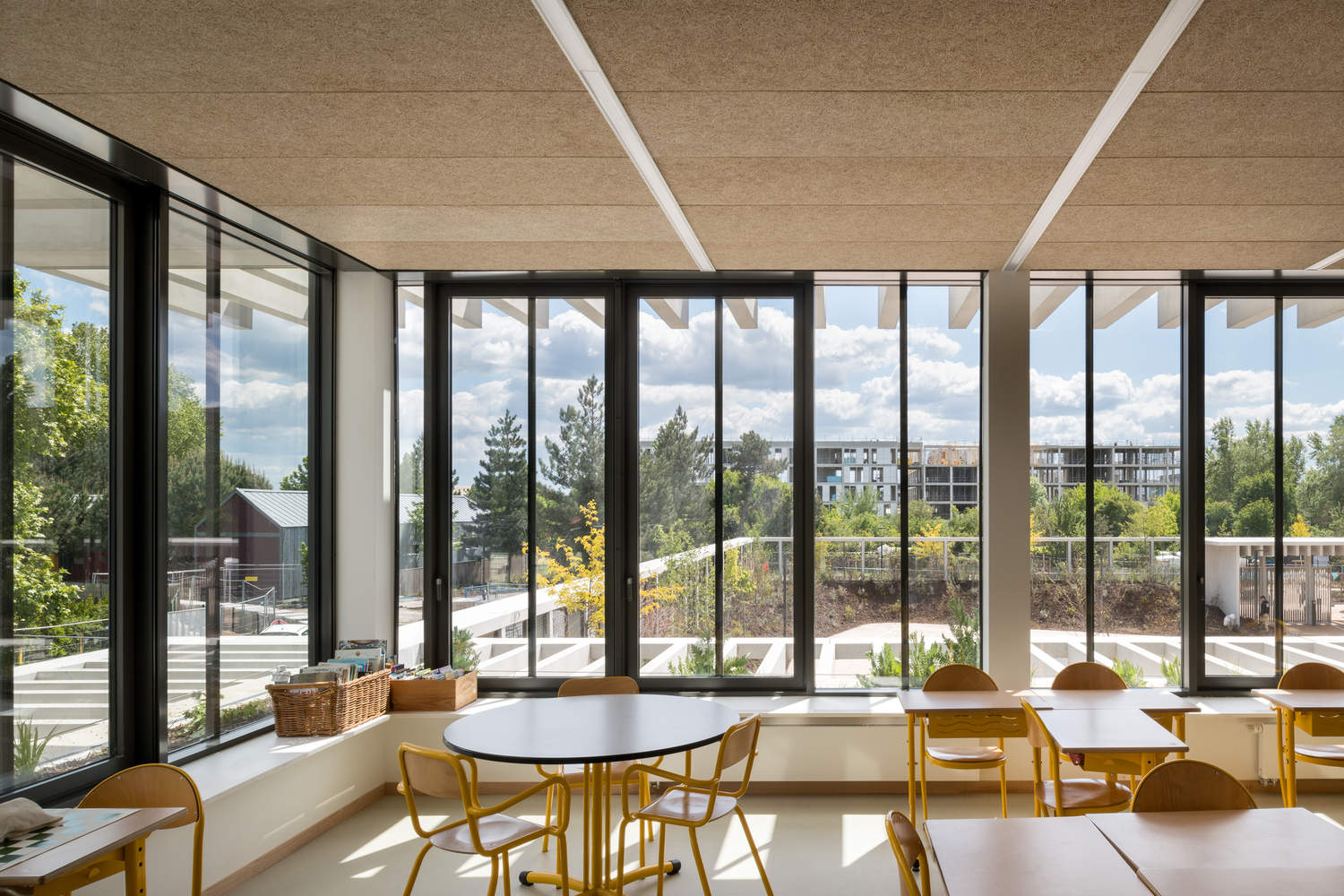 Designed with energy efficiency, scalability and carbon footprint firmly in mind, the school complex is labelled E+C- level E3C1 and reached level 1 of the « Biosourced Building » French label. Bio-based materials, particularly wood, were used whenever possible (wood fibre ceilings, wood wool insulation, linoleum flooring, wooden interior doors, furniture and cladding, and play areas made of cork) and 230 solar panels on the roof provide renewable energy. Anticipating future changes, the floor plan and partitions as well as the overall structure and façades have been designed to ensure the durability, flexibility and scalability of the building. With this in mind, we opted for a concrete post-and-beam system which has the advantage of providing open-plan, modular interior spaces.