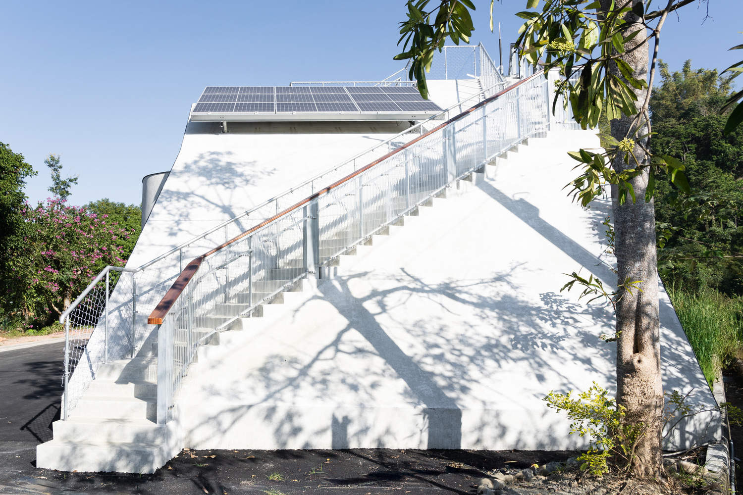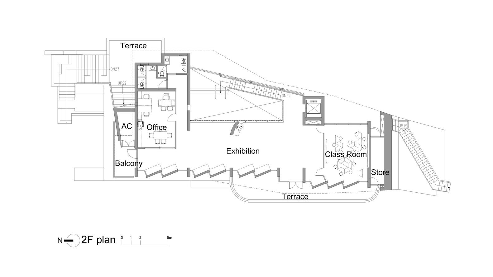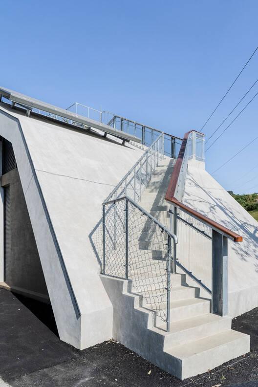 空间体验与情感连接:除了文化传承和可持续性,该项目在空间体验上也呈现出卓越的水准。无柱的内部空间设计创造了自由流动的空间感,与水库和溪流形成视觉上的呼应,增强了人与自然的联系。大窗框的设计将大坝、石神和保护区的景观引入室内,模糊了室内外的界限,让参观者在建筑中也能感受到周围环境的魅力。梯形建筑的形态、屋顶水滴形状的设计以及南向的阶梯等细节,都蕴含着丰富的情感,唤起了人们对历史、文化和自然的记忆。这种建筑设计不仅满足了功能需求,更关注人的情感体验,创造了一个充满诗意和人文关怀的环境教育中心。