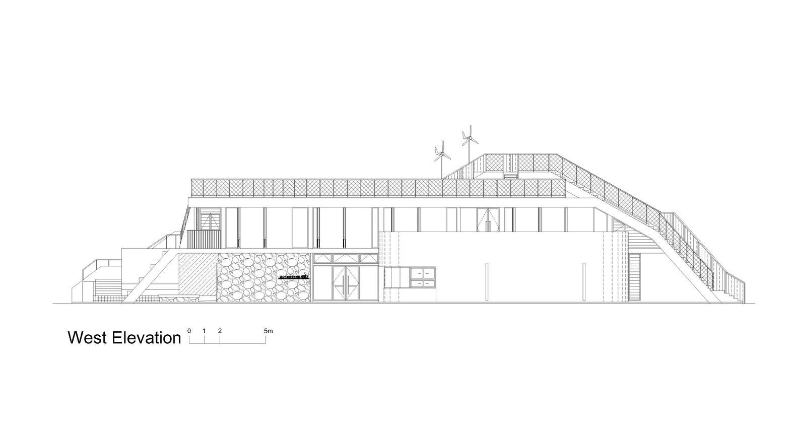 可持续性与环境和谐:项目在可持续性方面的表现也堪称典范。建筑师深谙如何利用自然元素,通过遮阳、自然通风和可折叠门等被动式设计手段,最大限度地减少能源消耗,实现建筑与环境的和谐共生。屋顶绿化和风力涡轮机等设计细节更是突出了开发与保护之间的平衡。此外,对当地材料的运用,如区域石材、再生木材和金属元素,使得建筑能够与周围环境完美融合。这种低技、低成本的设计理念,不仅降低了项目的造价和维护成本,更展现了对当地环境的尊重,体现了建筑师对可持续发展深刻的理解和实践。