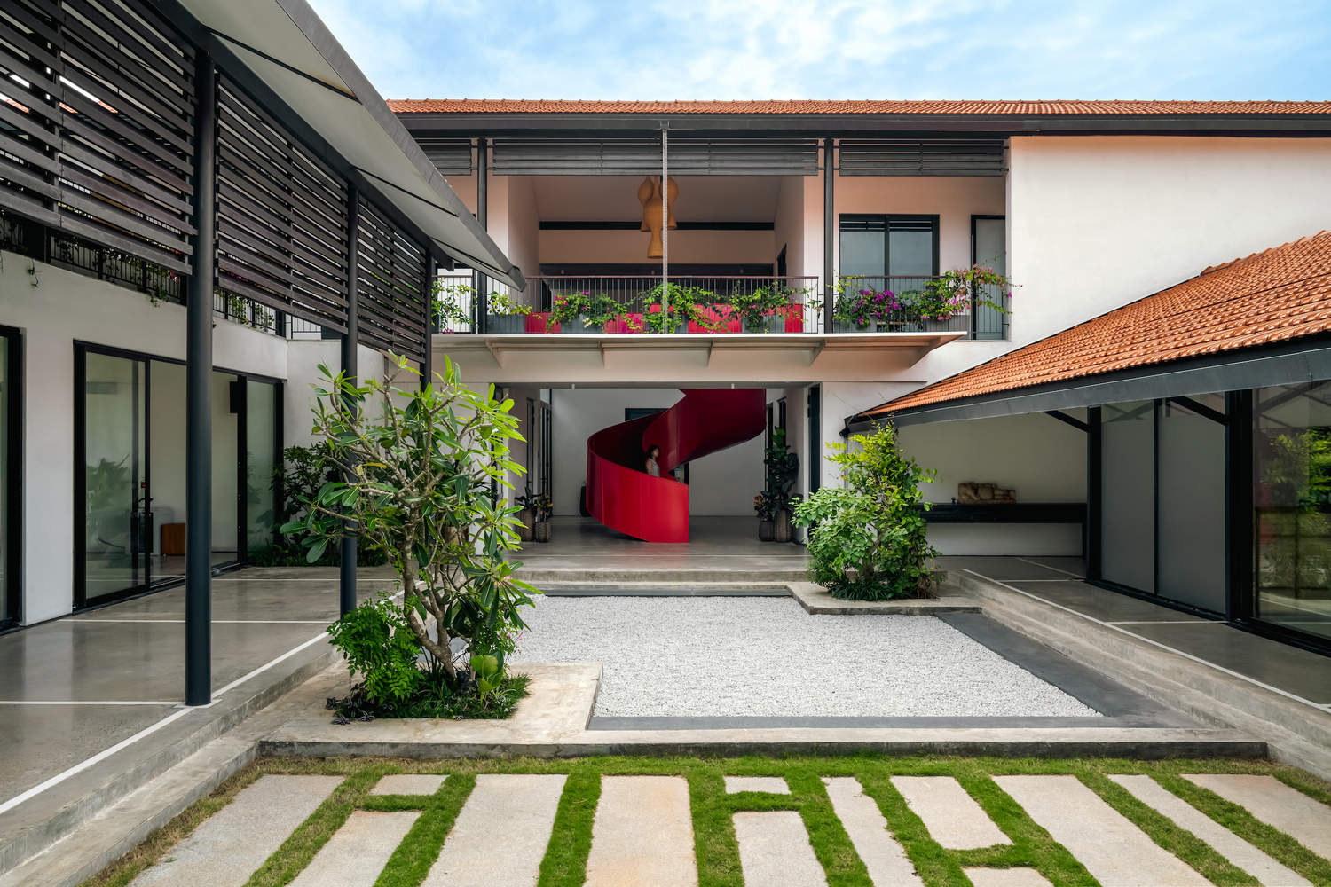 Deep overhangs, shaded walkways, and landscaped thresholds shape an environment that is inviting yet intimate. The Mangalore tiled roofs, with their generous eaves, recall the verandahs and jagalis of traditional homes—offering shelter while maintaining a strong connection to nature. Polished concrete floors with white marble inlays provide a cool, earthy texture, complemented by Sadarhalli pavers that enhance the tactile experience.