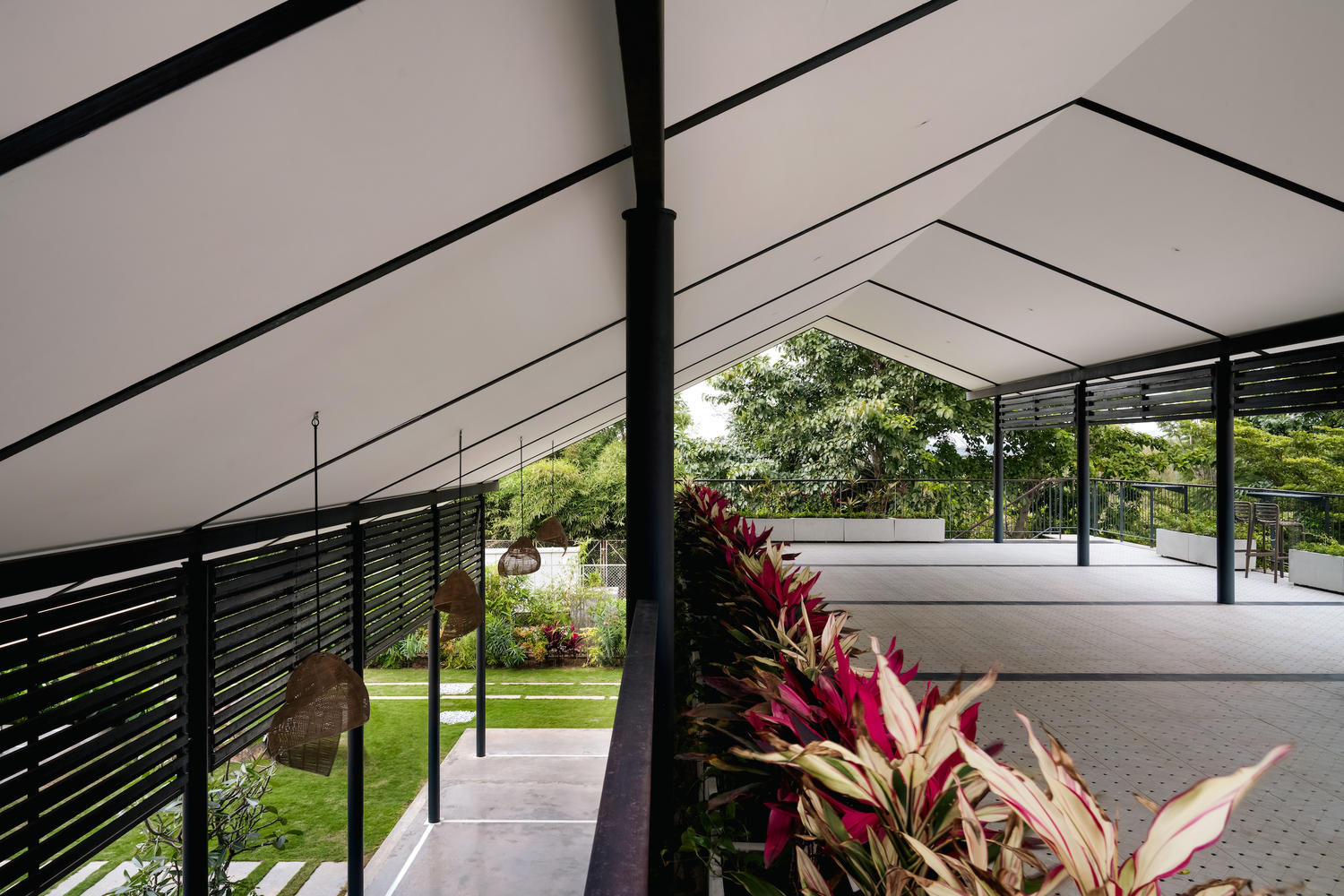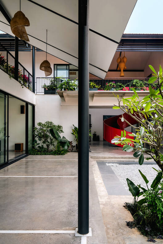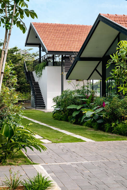 深深的悬挑、阴凉的人行道和景观门槛塑造了一个既吸引人又亲密的环境。芒格洛尔瓦屋顶,宽大的屋檐,让人想起传统住宅的阳台和日式凉亭——在提供庇护的同时,与自然保持着强烈的联系。抛光的混凝土地板上镶嵌着白色大理石,提供了一种凉爽的泥土质感,辅以Sadarhalli铺路石,增强了触觉体验。
