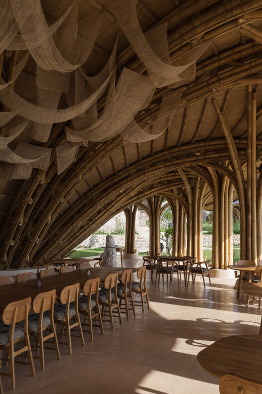 竹结构的创新应用:项目的精髓在于对竹结构的大胆创新和精湛运用。设计者从海洋贝壳和海浪中汲取灵感,赋予了餐厅独特的有机形态。黄色Petung竹子的弯曲屋顶,宛如贝壳的肋骨,优雅地从地面升起,形成了引人注目的视觉焦点。13个竹桁架的结构设计,不仅满足了建筑的结构需求,更赋予了空间一种流动感和通透性。前部的树状柱子,在提供支撑的同时,巧妙地引入自然光线,营造了舒适宜人的室内环境。这种对竹材料的创造性运用,展现了建筑师对材料特性深刻理解和创新设计能力。