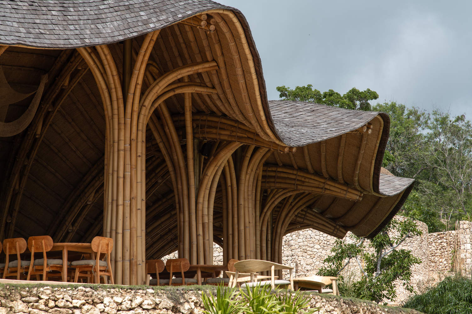 Intaaya's design is deeply inspired by the ocean and the marine species that inhabit it. For the Shell Restaurant, marine shells and the movement of the waves served as direct inspiration to create an organic and welcoming structure. The curved roof of yellow Petung bamboo, evoking the ribs of a shell, emerges naturally from the ground at the rear of the building, with 13 structural axes composed of 13 trusses made entirely from Dendrocalamus asper bamboo. These trusses, arranged at alternating heights, serve as the foundation of the organic roof. The roof is crafted from a hand-woven bamboo weave, complemented by wood shingles that maintain the natural materiality of the design. The trusses extend toward the front, where they are supported by steel pillars complemented by tree-like columns composed of paired bamboo poles. These front columns not only provide structural support but also allow natural light to enter the space, enhancing the interior atmosphere and reducing the need for artificial lighting.