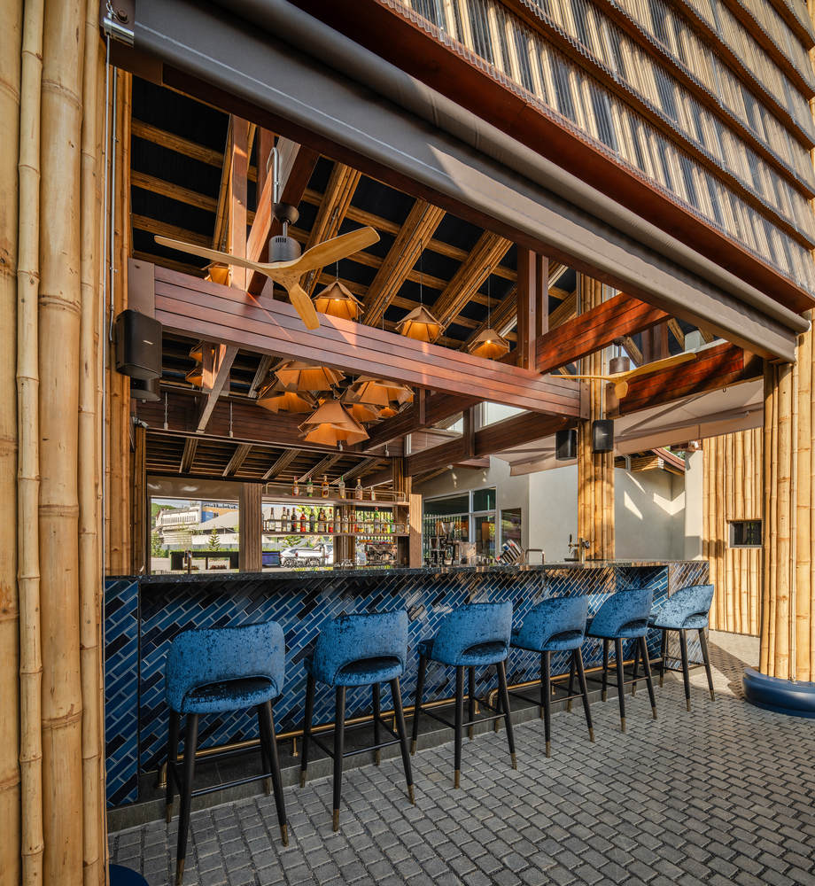 为了增强竹子元素的独特性,TasteSpace和Thor Kaichon开发了一种特殊的竹子蓝色染色技术,并将其融入到结构和室内设计中。这包括咖啡厅区域的蓝色染色竹天花板。立面以蓝色染色和天然竹子交替排列成鱼鳞图案为特色。在咖啡吧后面,一堵展示“SM”标志的穿孔墙是一个引人注目的设计元素。此外,吧台还装饰着蓝色斜瓷砖,强化了鱼鳞图案。