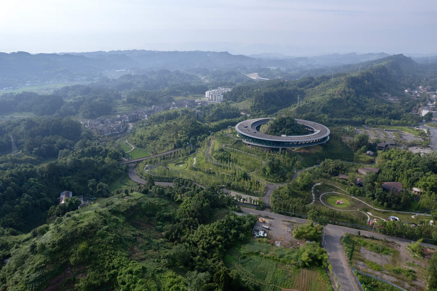 Text description provided by the architects. The project serves as a tourism hub leveraging surrounding rural resources. After on-site surveys, the design team selected a hilly area in southern Daguan Town, originally planned for high-rise residential development. The site features rich natural vegetation and varied terrain, with a central hill and a maximum elevation difference of about 60 meters.