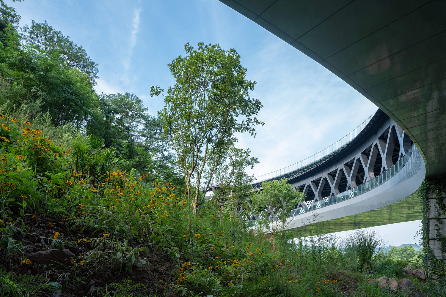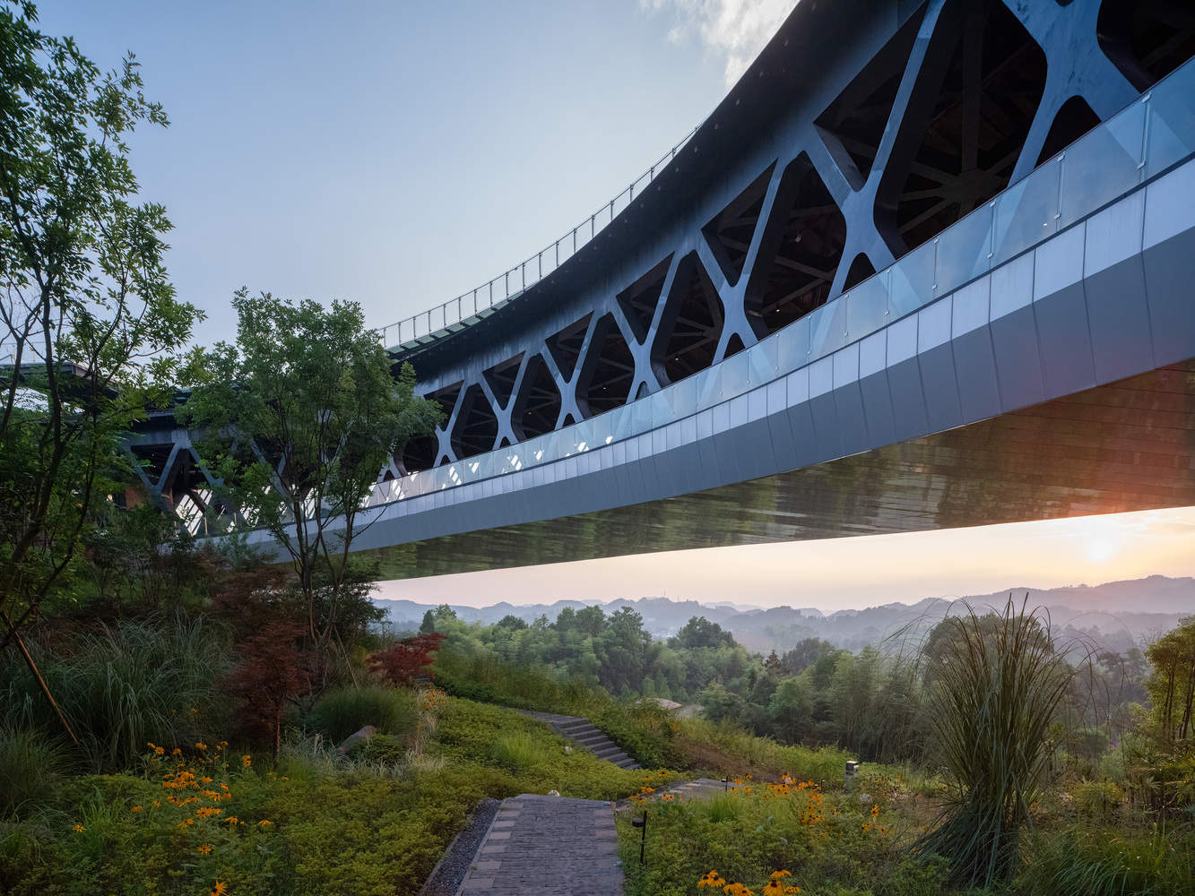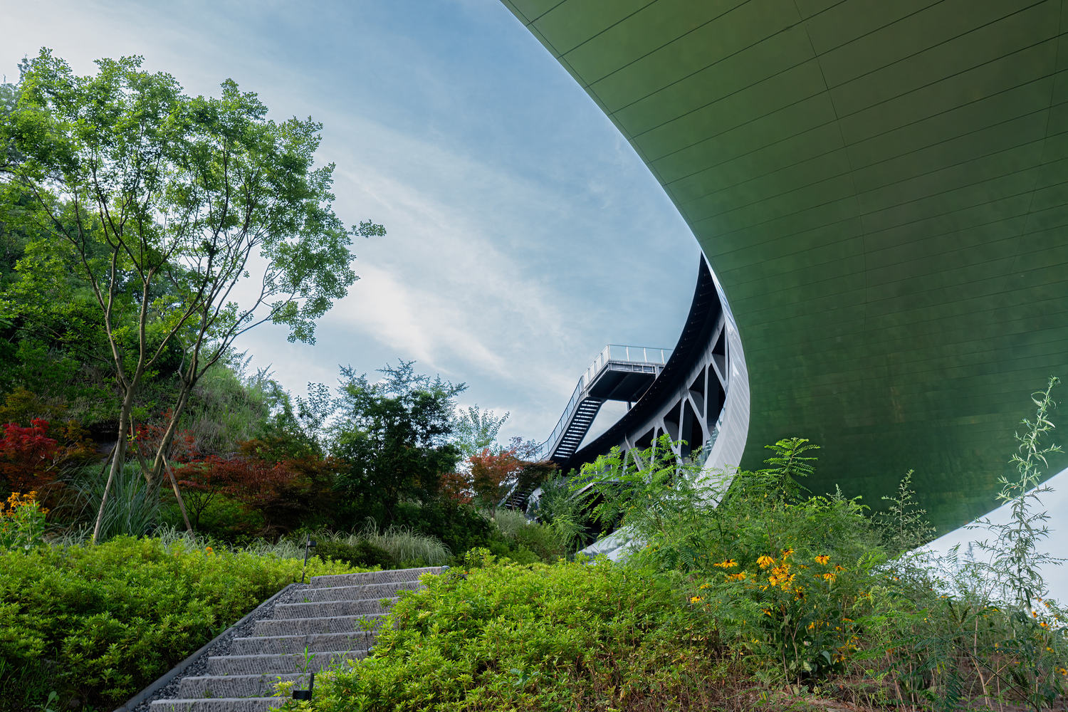 上部圆形部分有一座85米长的浮桥环绕着山丘,形成了一个风景优美的自然地标。屋顶光伏玻璃走道可以欣赏到外面的乡村景观和宁静的内山,继续与保存完好的山寺对话,成为自然的精神象征。