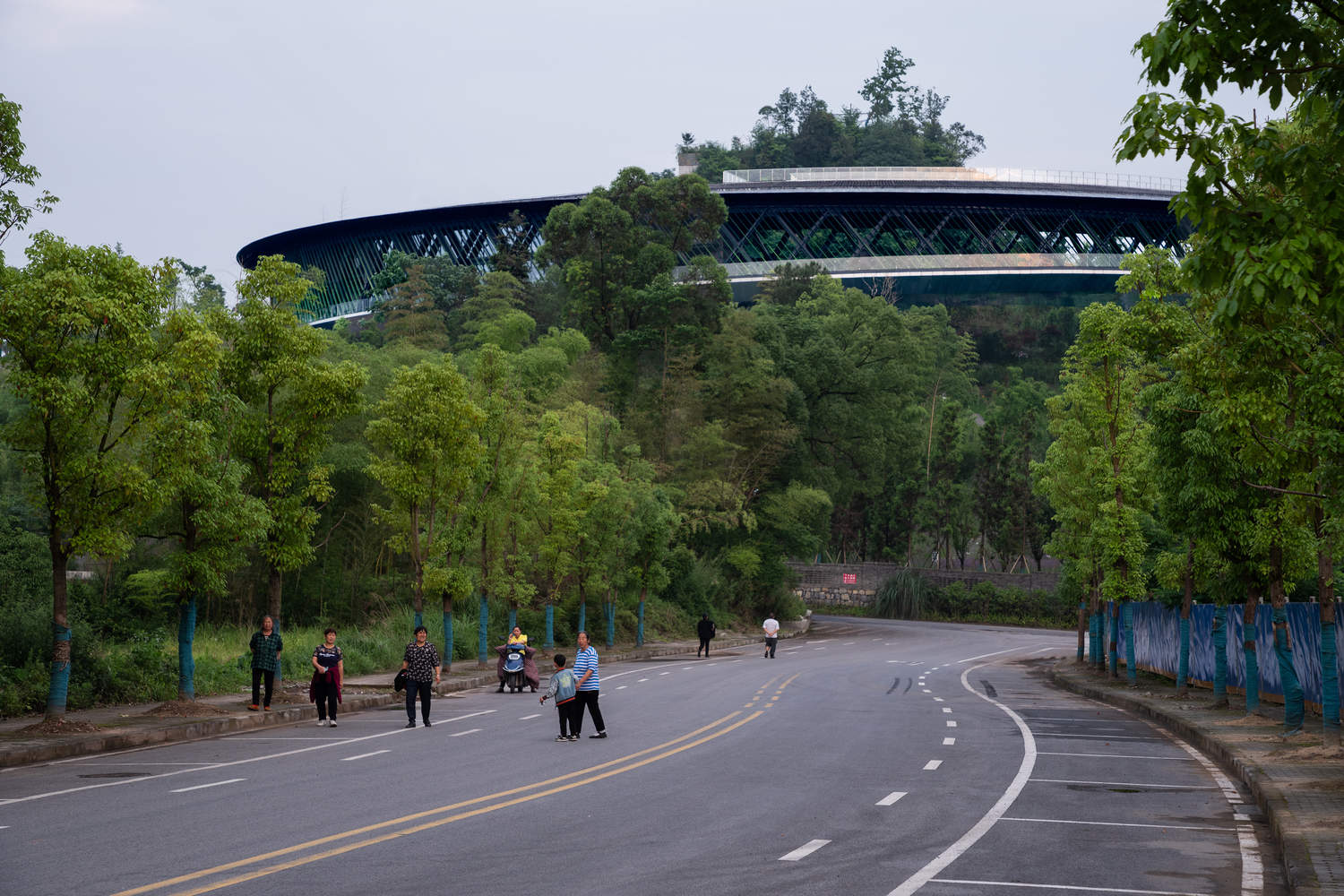 The upper circular section features an 85-meter floating bridge around the hill, creating a scenic natural landmark. The rooftop photovoltaic glass walkway offers views of the rural landscape outside and the serene inner hill, continuing a dialogue with the preserved mountain temple, serving as a spiritual symbol of nature.