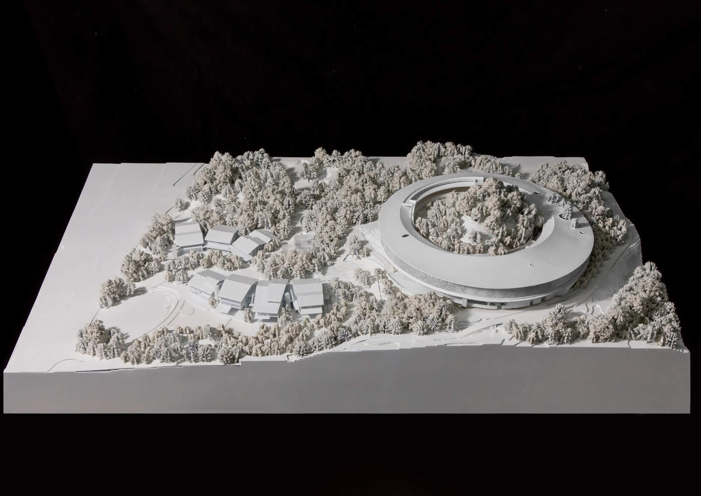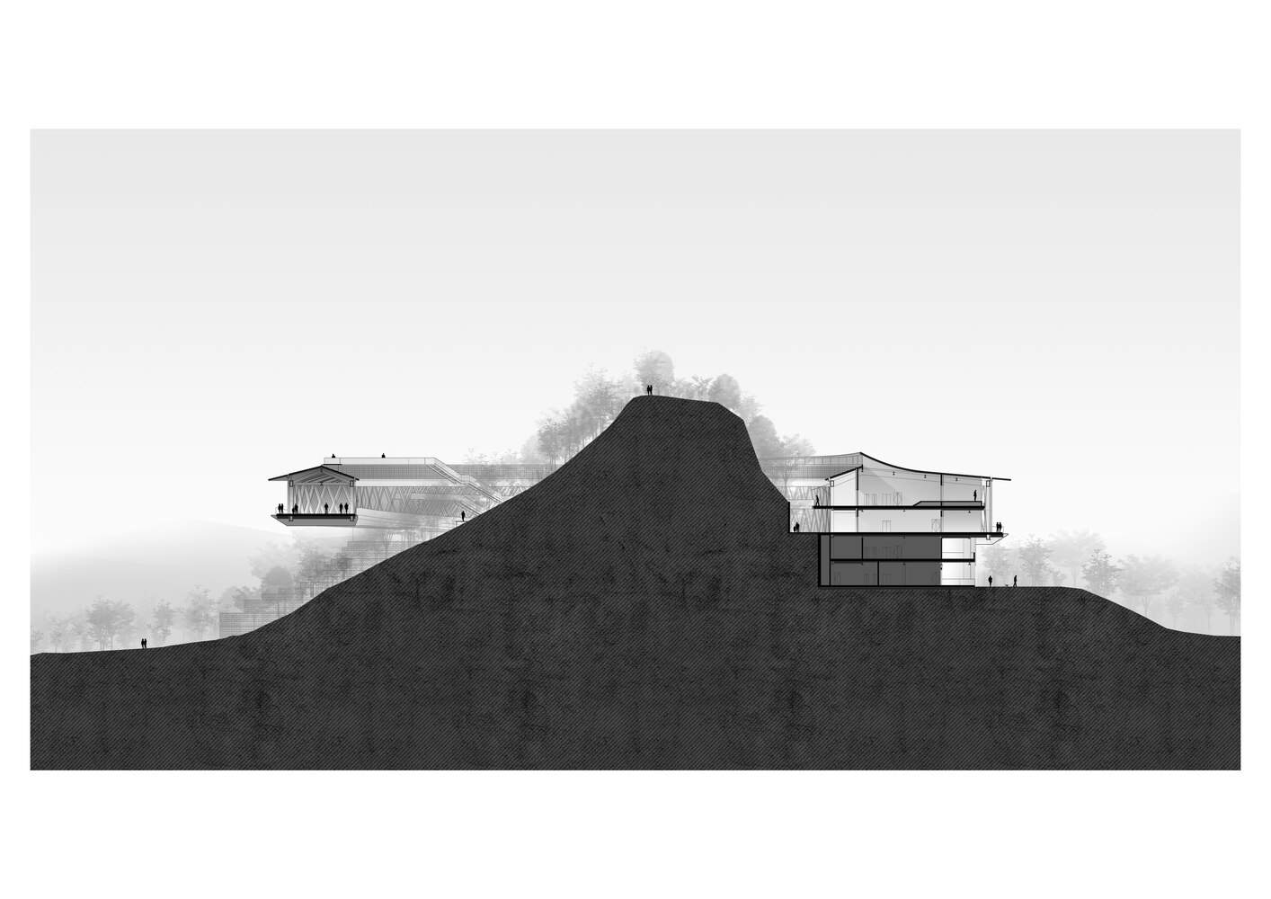 复杂的地形变成了自然景观。两组建筑对环境的反应不同。山脚下的市场被分成小单元,沿着斜坡,使用高架结构来适应地形。山顶的环形结构环绕着自然山丘,强调了自然的中心地位。通过保留原始地形和植被,该遗址变成了一个乡村公园,建筑和自然交织在一起,形成了景观的一部分。