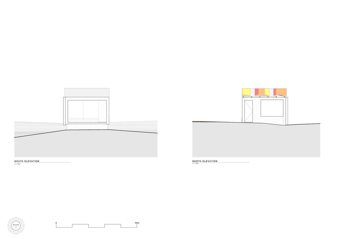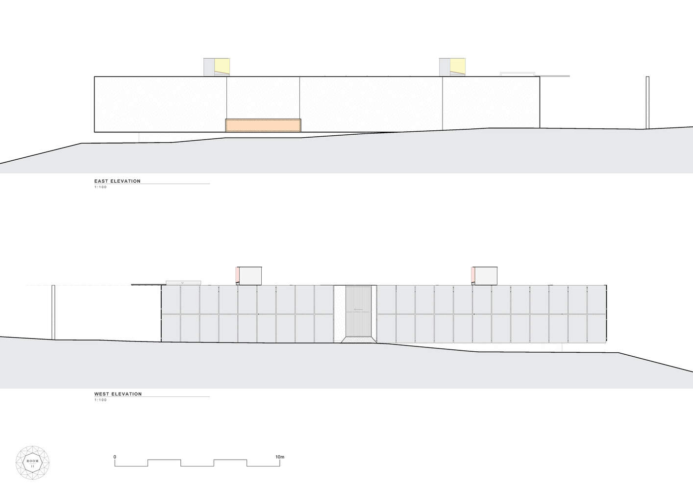 Off-grid hideaway – Clad with an entire façade of solar panels facing west, the structure is energy-sufficient and runs off-grid. "The entire western façade is derived from the geometry of the solar array. An unequivocal statement of prioritising green energy production in contemporary construction. It's a celebration of a new frontier in sustainable construction. As far as we are aware, this is the first building to feature an entire façade created by solar technology, making the most of the location's latitude", says Bailey. With engineering ingenuity, the building's elevation from the ground minimizes the construction's direct footprint. During the design process, Room11 conducted surveys of every tree onsite and articulated roadworks around significant trees. A narrow construction corridor was established so that the impact on endemic vegetation was kept to an absolute minimum.