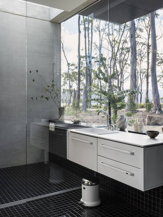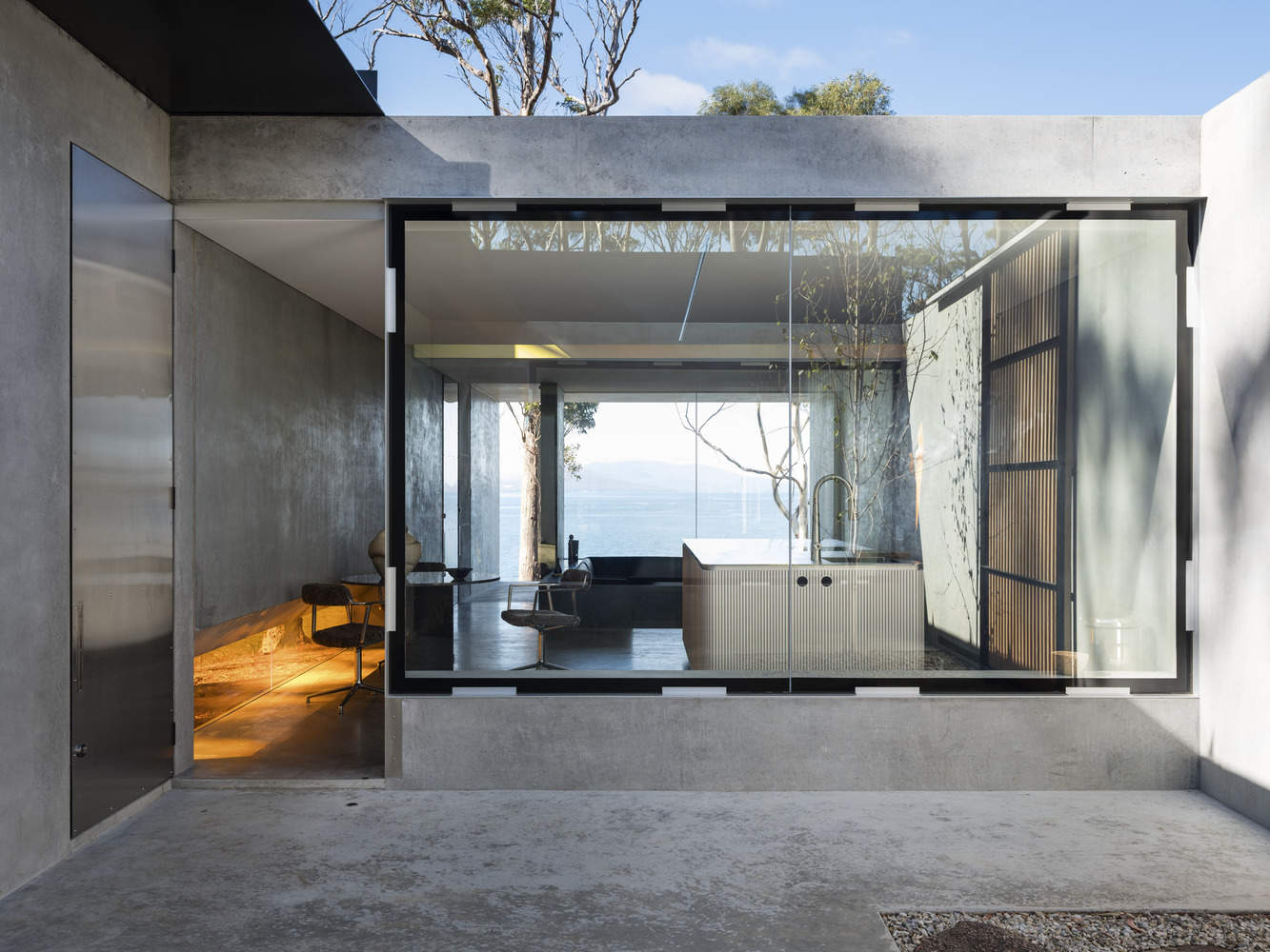 In the 1,700 sq ft / 160 m2 building stretching 30 meters, wall-to-wall glass and recessed steel doors provide unobstructed views to the soulful landscape of the Tasmanian sea and mountains. Floor-to-ceiling windows and light wells imbue the space with a sense of luminosity. An atrium yard separates the main living space from the primary bed and bathroom, while at the end of the tunnel, a glass door leads to a framed terrace floating above the land – showcasing an architectural finesse that underscores the sensation of being at the edge of the world. "The dramatically elongated proportions of the structure respond to the landscape by purposely framing the D'Entrecasteaux Channel with a broad expanse of frameless glass. By this methodology, the user is located in the extraordinary, natural landscape of Tasmania's Bruny Island," adds Bailey.