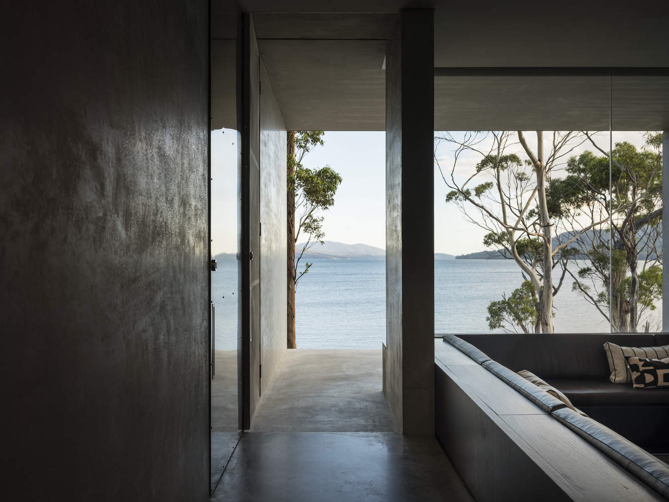 Often referred to as 'the edge of the world', Tasmania is distinguished by its sense of otherworldliness. In this corner of the world, immersive surroundings have a grounding effect, reminding us of our connection to nature. Disembarking the small 20-minute ferry from Hobart to Bruny Island is a transportive retuning to the frequency and rhythm of the natural world. Setting the compass to 42° south of the equator, guests are greeted by a couple of rare, white wallabies roaming the vast plot of land on the north-western point of Bruny Island. Where rugged bushlands meet the ocean, the concrete structure defies gravity above a terrain punctuated by a 300-meter sea stretch with a 280° view of the D'Entrecasteaux Channel connecting Bruny Island to Tasmania's main island.