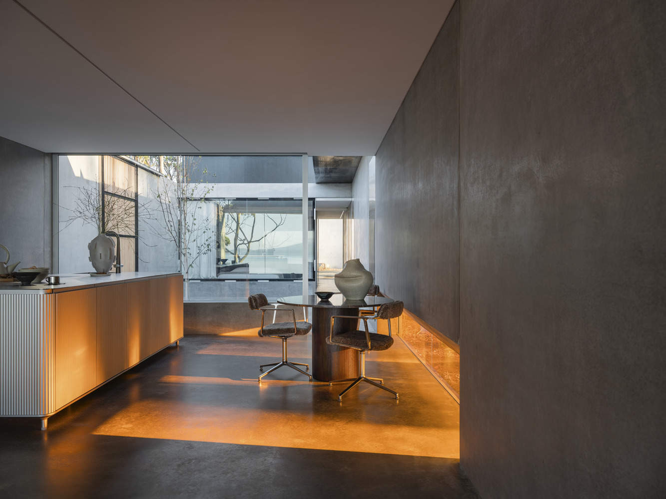 A separate, 375 sq ft / 35 m2 concrete cube with 4-metre-high ceilings, referred to as 'the studio,' offers an escape to a space of visual and sensory calm. Ideal as an office or meditation room, its spare design highlights the architecture and comprises only a Vipp Swivel chair against an integrated desk and a hidden mezzanine double bed.