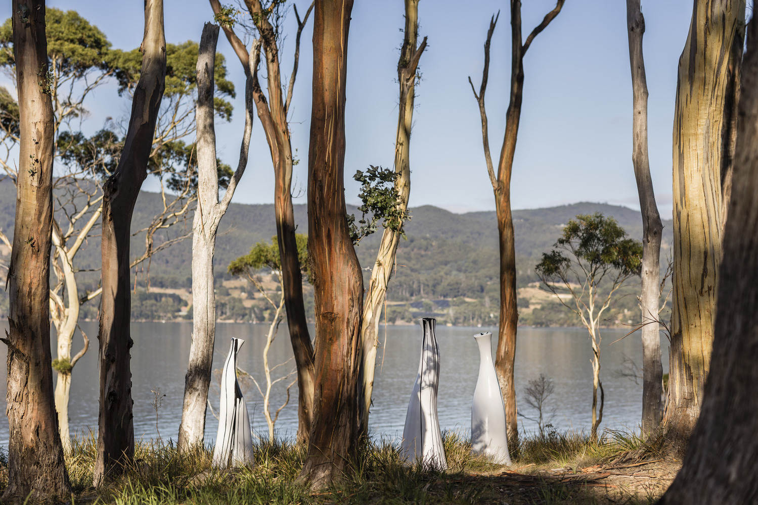 To further strengthen the unique marriage of Danish design and Australian architecture, Danish artist Lin Utzon has brought an edition of her iconic 'Cosmic Dancers' series to the shores of Bruny Island. Placed among the property's red gum trees, the large-scale black and white ceramic sculptures echo the elongated strokes on the characteristic trees. As the daughter of Jørn Utzon, the world-renowned architect who designed the Sydney Opera House, Lin's ties to Australia run deep. Now a successful artist in her own right, Lin's work often mirrors her father's philosophy of harmonising art and architecture. The display of her 'Cosmic Dancers' in the Australian bushland alongside the architectural design of the Vipp Tunnel creates a strong connection to these aspects of her life and work.