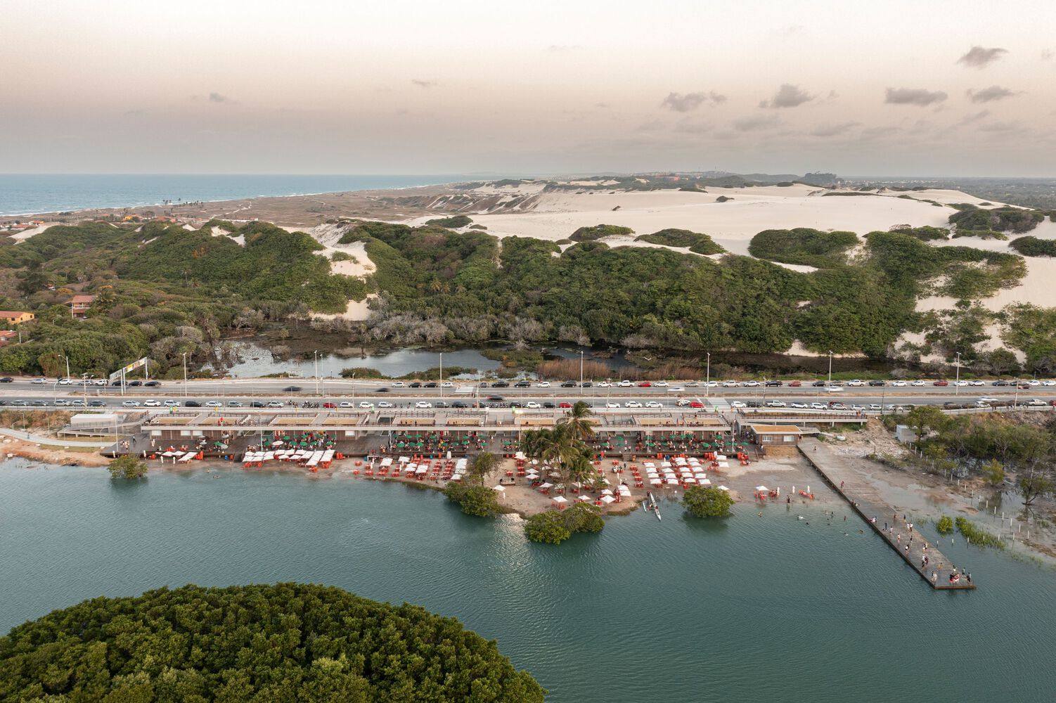 Using ramps or stairs, visitors can access the ground floor where they find a large platform purposely suspended from the natural terrain, absorbing the tidal variations in the area and allowing for the recovery of native vegetation. In this area, there are 20 kiosks equipped for the preparation of traditional Sabiaguaba cuisine dishes. With fresh fish, shellfish, and seafood, the permit holders, all members of the native Sabiaguaba community, prepare traditional dishes such as steamed oysters, fish stew, coconut baião, and shellfish farofa.