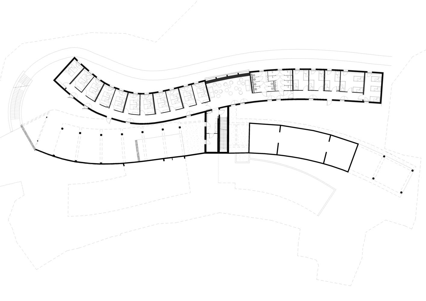 The former gîte, aging and scattered across the site, no longer met current needs. The goal was clear: to design a more compact gîte, capable of accommodating 100 people while achieving total energy autonomy. The building, the result of collaboration between architects, engineers, and landscape designers, draws its inspiration from the basaltic "corded lava" flows of the Piton de la Fournaise. This concept is expressed through three undulating curves, modeled to fit the site's topography. The curved line became the guiding thread of the project, echoing the winding paths that meander through the volcanic massif.