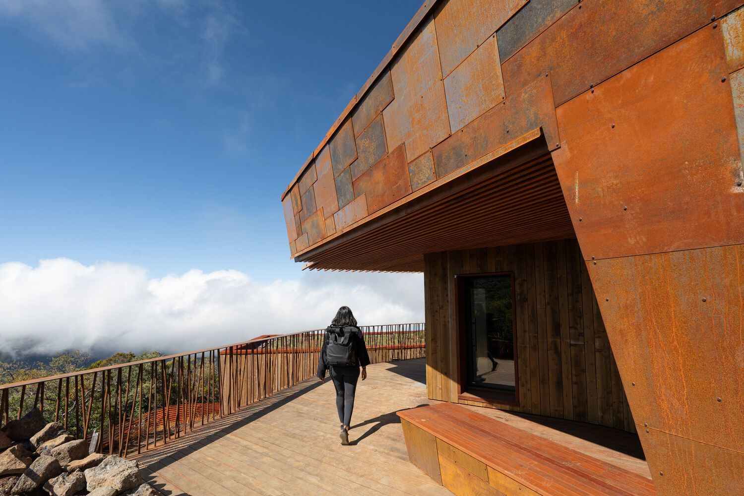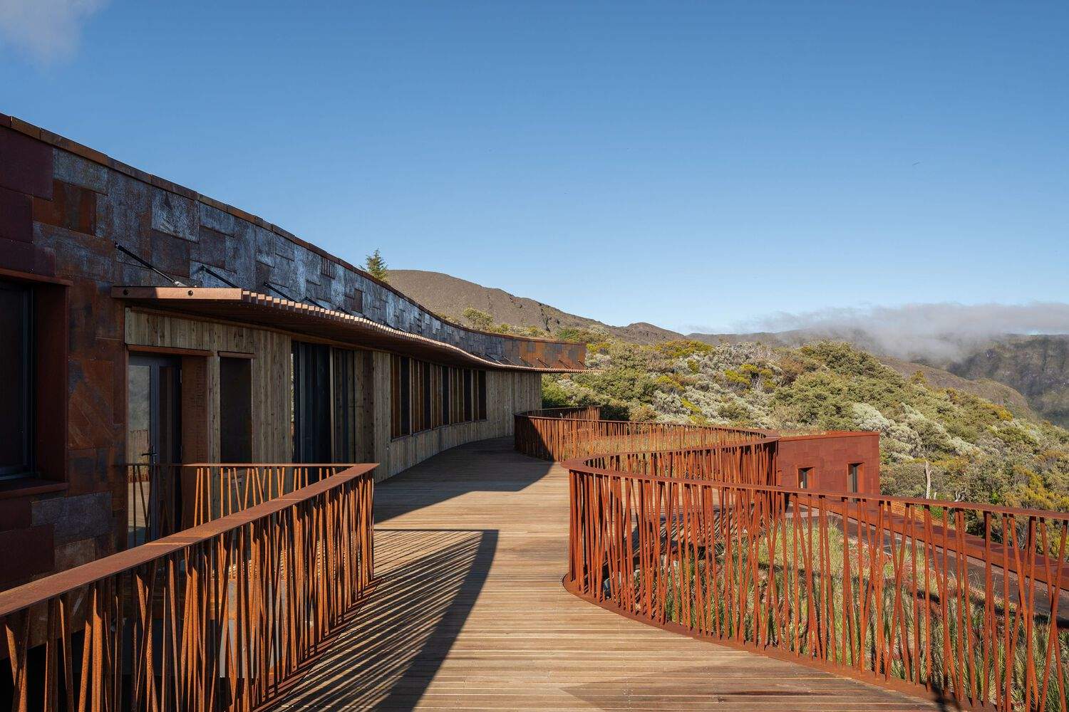 In harmony with the volcano, authentic materials and colors were chosen: facades clad in weathering steel shingles, with rust-toned hues, subtly reflect the colors of the Piton de la Fournaise. In symbiosis with the surrounding forests, cryptomeria, a locally sourced wood, was used to clad certain facades and craft the furniture in the rooms.