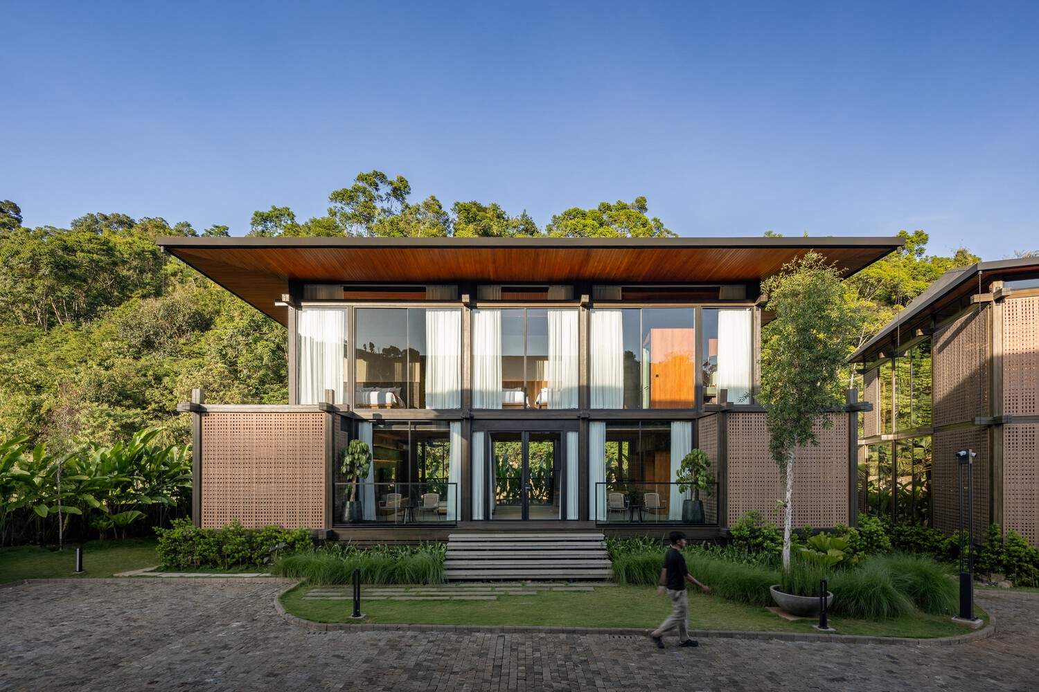 木制婚礼场地:将传统与现代相结合-K-Thengono设计工作室的任务是设计肯卡纳山谷的婚礼场地,包括一座朴素的小教堂、一座家庭别墅、一座新娘别墅、一栋服务楼和一座桥。这座小教堂的设计方法从巽他建筑独特的弧形屋顶线条中汲取灵感,这种建筑原产于该建筑群所在的茂物地区。其有机形状的屋顶由胶合木拱门制成,覆盖着梅兰蒂和西拉普林木材,为潘格兰戈山的如画美景提供了框架,为婚礼仪式营造了田园诗般的背景。
