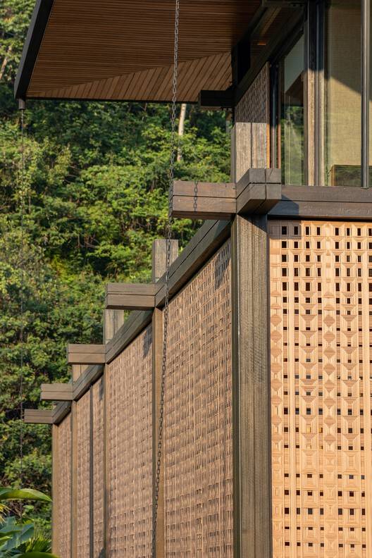 这座三居室家庭别墅反映了传统建筑风格,高出地面,适应了场地的丘陵地形,并保留了土地的自然特征。木梁由当地采购的以强度闻名的aliwowos木材制成,采用手工接缝以3.5乘3.5米的网格图案进行战略性布置,并作为内部的一部分暴露在外。