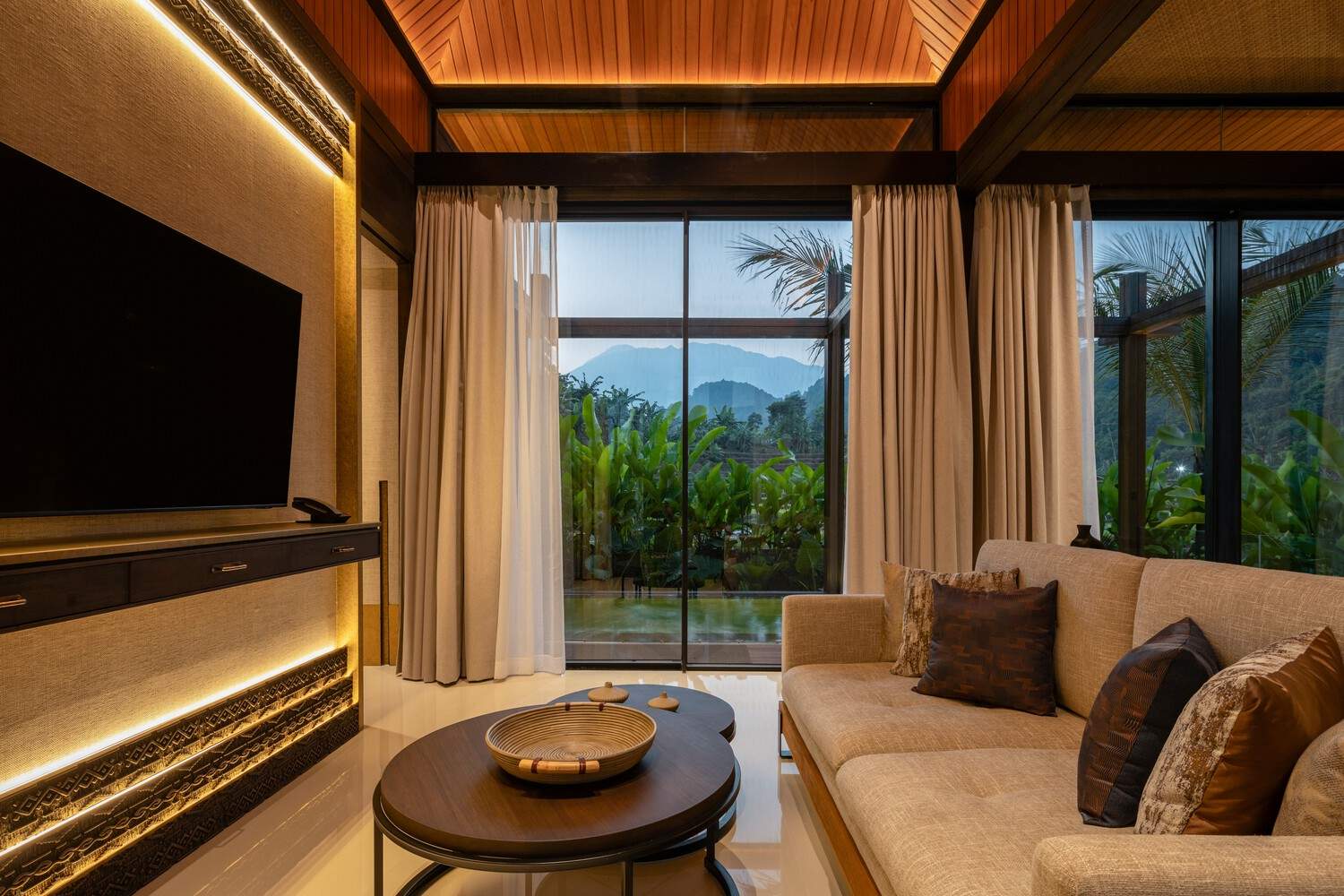 进入别墅,客人会受到玻璃墙生活区的欢迎,可以欣赏到周围广阔的景色。同时,编织的藤条板保护了卧室和服务区的隐私。别墅的墙壁和地板采用nyatoh木板装饰,内部还以安山岩为特色,游泳池内衬苏卡布米的天然石材。定制的雕刻柚木橱柜、黄铜浴室配件和其他木制细节为别墅的自然美学增添了奢华的气息。