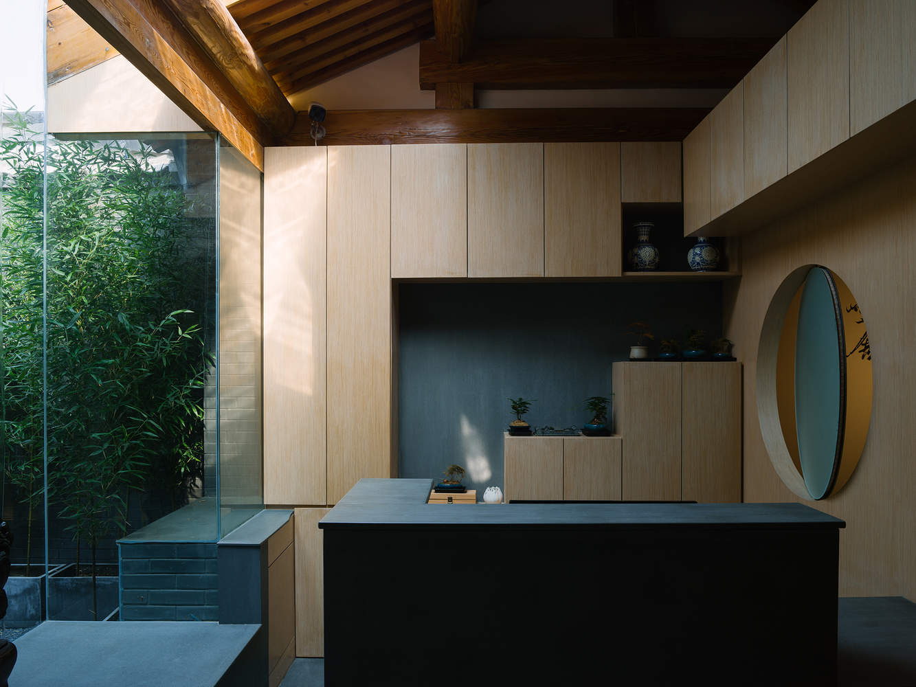 待翻修的建筑是一座标准的单入口四合院。该项目位于天桥的竹子营胡同。通过插入式结构和屋顶,设计模糊了原始庭院、内部和外部之间的界限。新建的庭院与室内空间融为一体,将自然风光、充足的空气和自然光线带入室内。