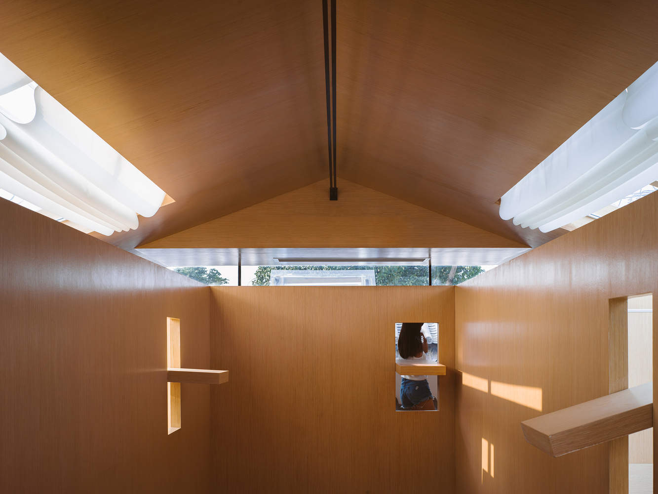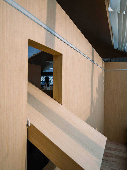 The newly built "pigeon cage" is a pure geometric form placed on the roof. It visually interweaves with the original roof, and the blue brick gable and eave tiles are wrapped into the interior. The skylight glass on the roof is equipped with semi-transparent shading curtains, filtering the sunlight into a softer light. This series of treatments blurs the boundaries between indoor and outdoor spaces, contrasts and unites modern and traditional architecture, and creates a contrast between bright and warm atmospheres. The relationship between new and old becomes ambiguous. The suspended "pigeon cage" is built with steel structure and is structurally separated from the brick and wood structure of the main building. The clear structural relationship allows the original wooden structure to be exposed.