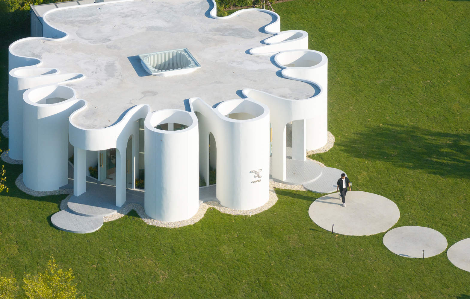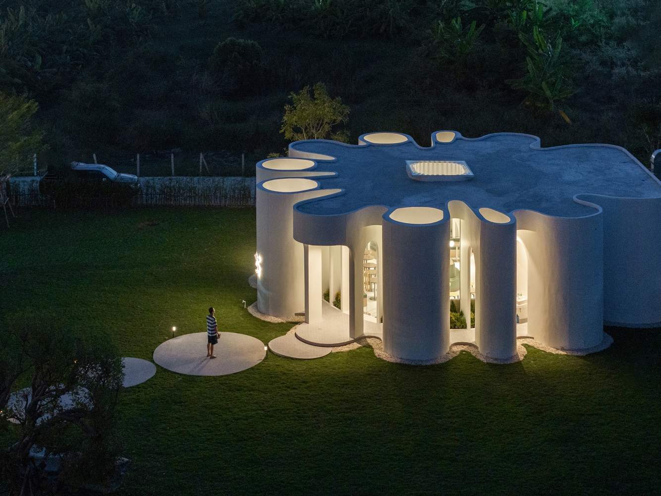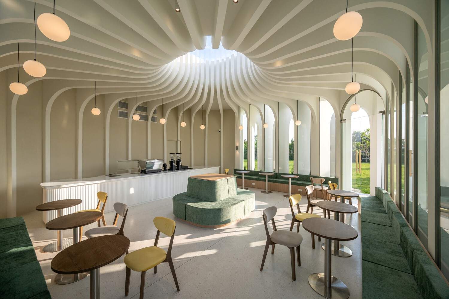 几何语言的有机表达:项目的精髓在于它对“绽放”概念的完美诠释。设计师从现场自然生长的花朵中汲取灵感,将花朵的径向对称性转化为一种独特的几何语言。这种抽象的设计手法,将自然的曲线提炼成一种富有韵律的“日出线”和径向结构,巧妙地呼应了花瓣的动态。这种设计语言不仅体现在建筑的平面布局上,更体现在建筑的结构和空间组织中。建筑师通过对曲线的运用,创造了一种流畅、开放的空间体验,为顾客带来独特的感官享受,也使得建筑本身充满了生命力。