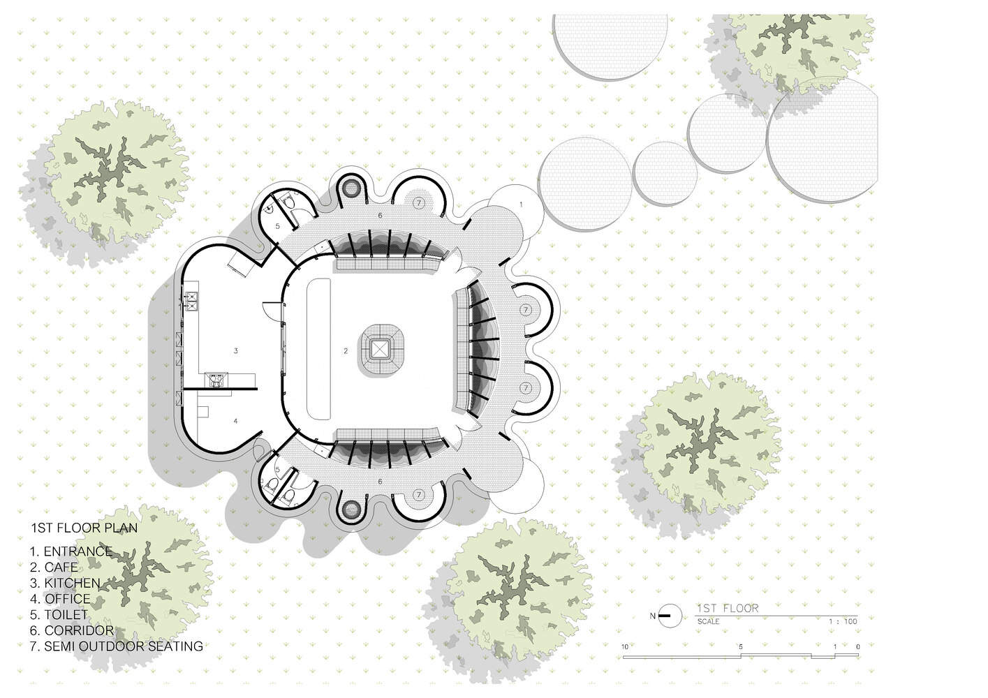 To create contrast, the outer boundary follows a squared framework, providing a sense of definition in the otherwise open landscape. The café's circulation, however, follows a subtractive design approach—spaces are carved out to define the movement, creating a slow reveal as visitors navigate through the outdoor areas. These pathways intertwine with green pockets, fostering an auto-landscape effect where architecture and nature light coexist seamlessly.