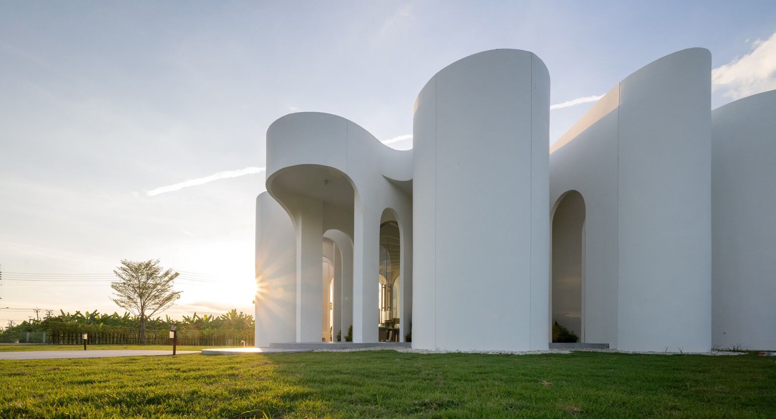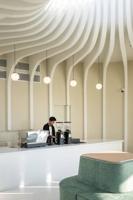 Text description provided by the architects. A Blooming Flower in Bangkok's Industrial Landscape. Curvy Dining, designed by Unknown Surface Studio, is a delicate white dining café emerging within an industrial landscape located at Soi Srinakarin - Rom Klao 19, Bangkok. This contribution transforms an expansive, boundary-free site into a stand-alone dining café that is thoughtfully designed to foster a seamless dialogue between architecture and nature. The café balances openness and enclosure, creating an inviting space that blurs the line between built form and the surrounding environment.