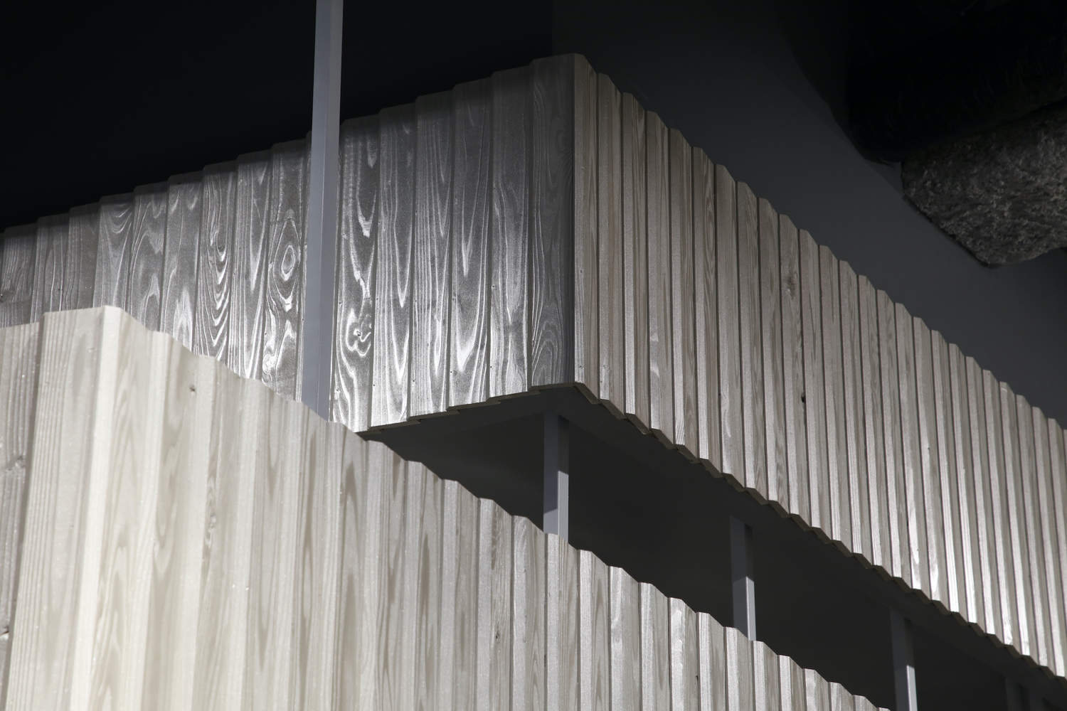 Fire-Resistant Wooden Structure Design – The four layers of the wood structure section consist of a continuous rigid, wooden-frame structure facing the street. The columns and beams are made of COOL WOOD by Shelter. The structure consists of two reinforced gypsum boards (21 millimeters thick) as cladding material on the surface of the load-bearing members, and 20 mm thick wood as surface finish material. The structure is certified as one-hour fireproof.