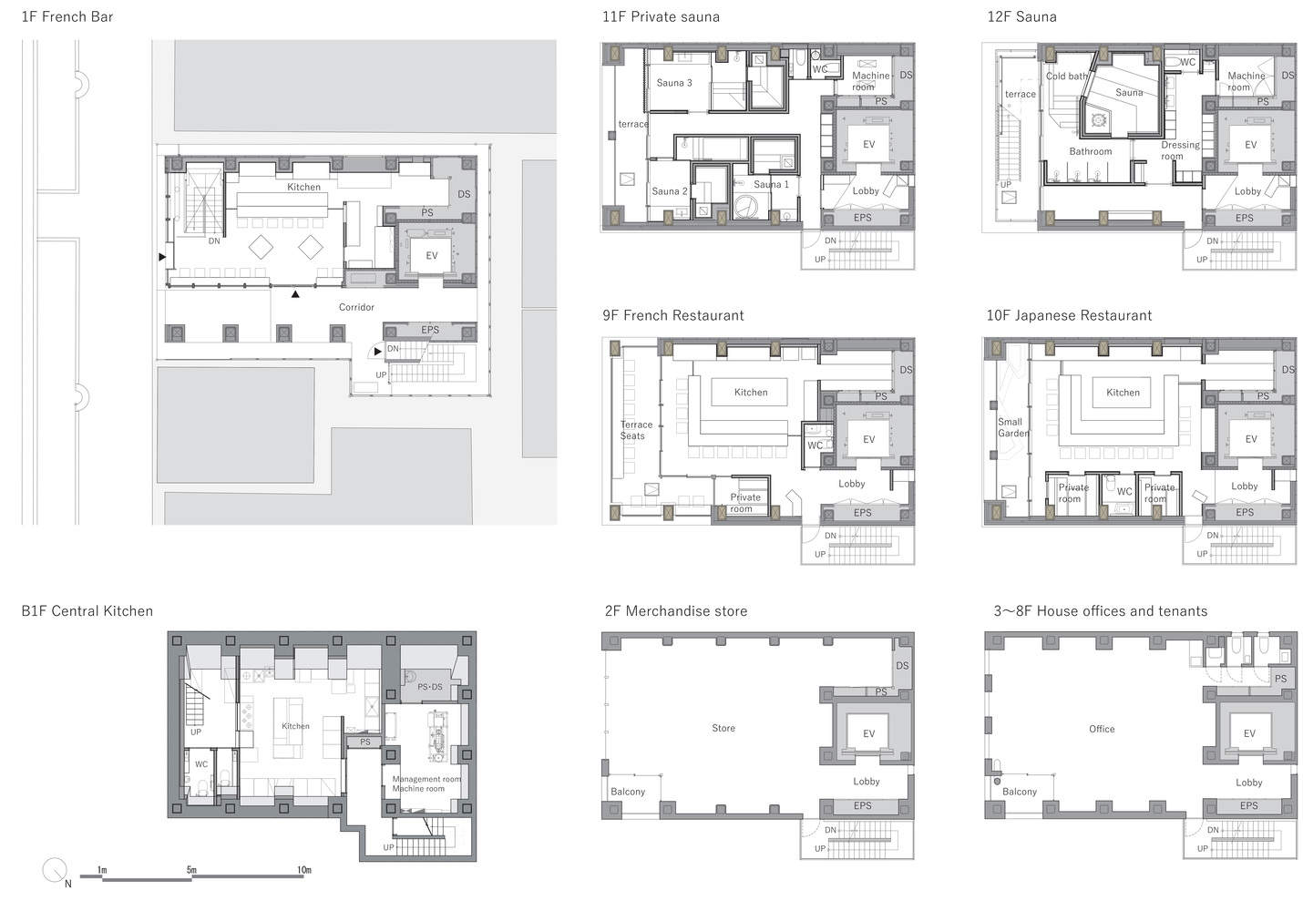 最初,人们考虑建造一座完全木制的建筑,但由于防火、结构和成本方面的挑战,这是不切实际的。解决方案是采用木质上层的混合结构,提供一小时的防火能力,同时最大限度地提高效率。该设计还将传统的银座小巷式元素与上层的开放空间融为一体。