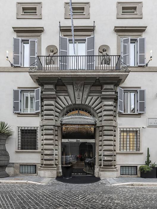Text description provided by the architects. The classical interpretation of Rome as a palimpsest of architectural layers—Baroque buildings atop Renaissance and medieval structures, themselves atop their Roman predecessors—includes a final layer of verticality: ceilings of painted trompe l'oeil arches, heavenly vaults, and celestial chambers populated with ascendant saints, martyrs, and putti. From the very beginning of her career, Zaha Hadid sited her buildings in the air, floating buildings on shadow, light, and seams of space that lifted volumes above the ground, relating her work to another tradition—Rome's. Hadid, and the city's architects of the Renaissance and Baroque that preceded her, aspired to the air, the skies, and the heavens. In designing the hotel conversion of the Palazzo Capponi, on the Via di Ripetta, a branch of the city's Sistine Trident radiating from the Piazza del Popolo, Hadid and her team at Zaha Hadid Architects (ZHA) led by Paola Cattarin, started where Baroque architects ended their palimpsest—at the vaulted ceilings.