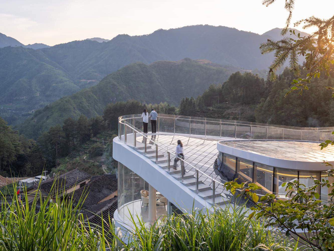 The two-story structure comprises a tea bar, tea culture exchange area, and a scenic leisure space, each offering spectacular views. The elegant curves run through the entire space, seamlessly integrating the architecture with the interior design and ensuring the unity of the overall concept. The panoramic glass walls allow villagers and visitors to view each other, forming a mutual appreciation.