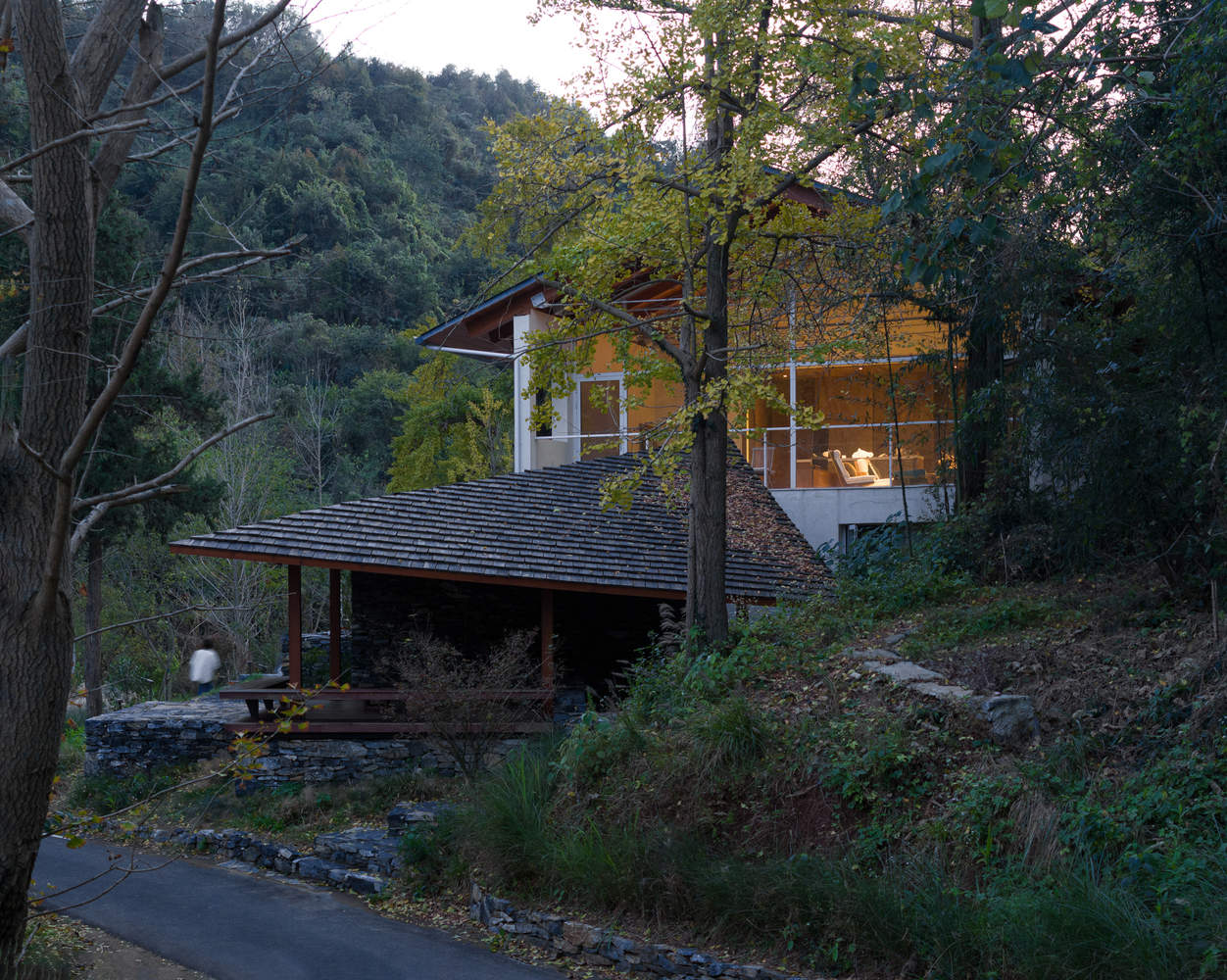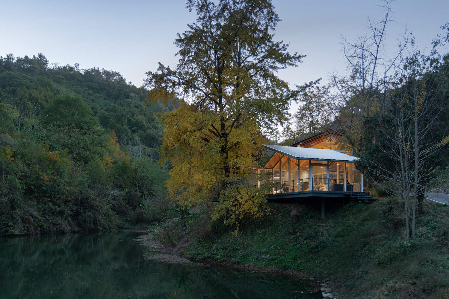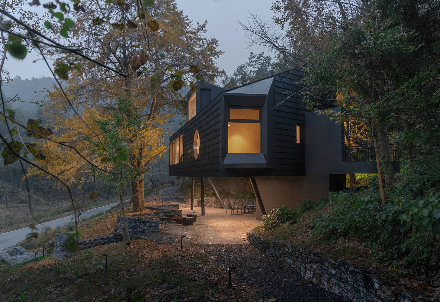 The treehouse stands at the junction of two paths leading into the valley. The site design avoids the roots of ancient trees while accommodating two standard guest rooms and a utility storage room. The entire structure is elevated, allowing the lush ginkgo canopy on one side to serve as a privacy screen for the guest rooms while also providing a scenic view.