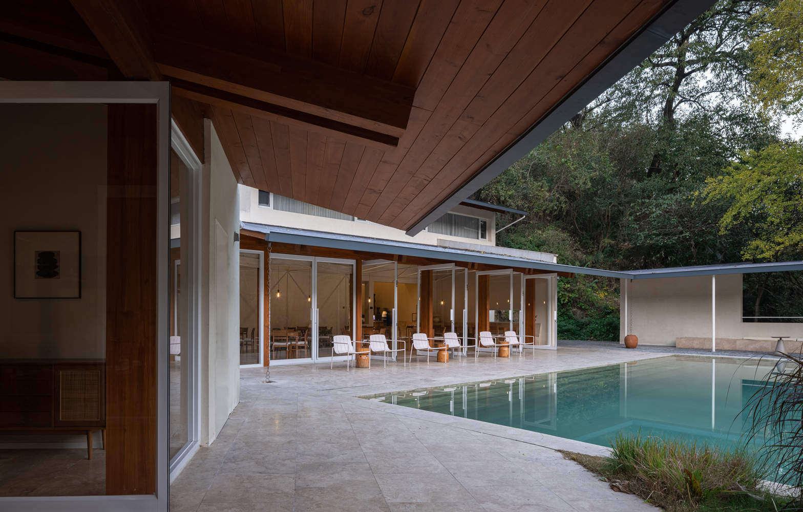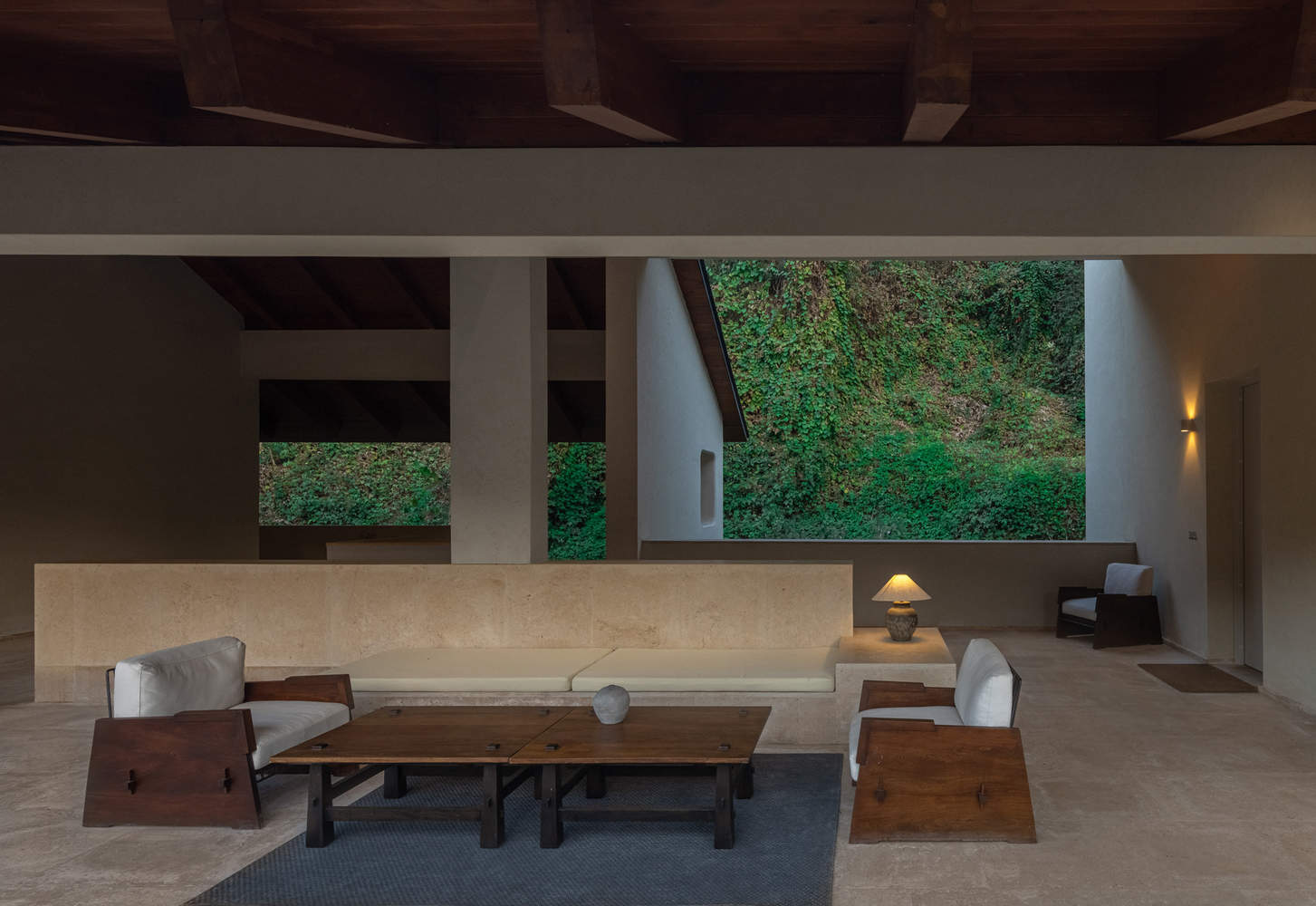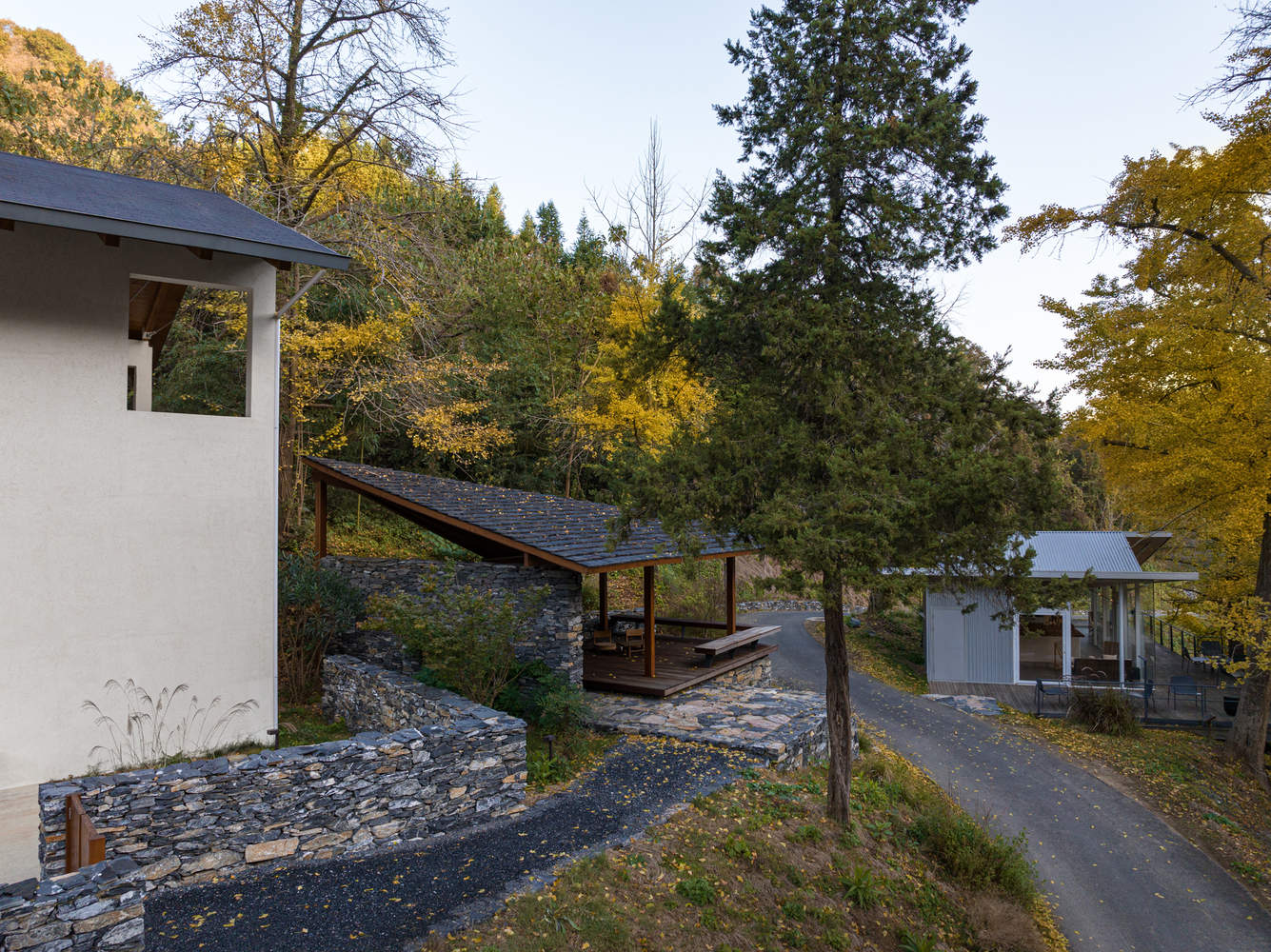 开阔的地面自然成为一个半户外活动区,用于用餐、烤银杏果和荡秋千。一座开放式茶亭由深色木材、烧焦的雪松木瓦和当地粗糙的石头建造而成,与两座白色建筑(咖啡馆和客房)之间的环境无缝融合。