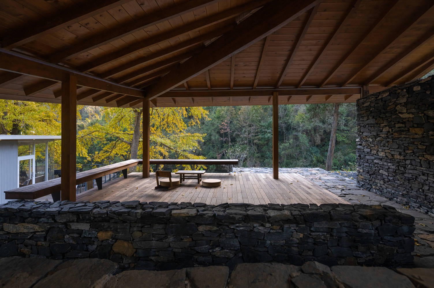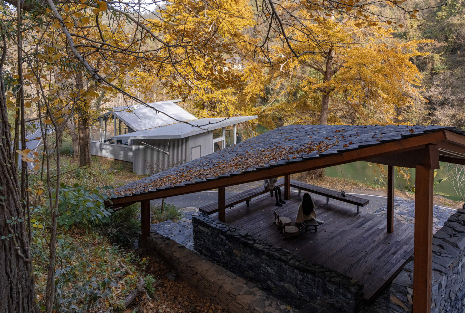 The open ground level naturally becomes a semi-outdoor activity area for dining, roasting ginkgo nuts, and swinging. An open tea pavilion, constructed from dark-toned wood, charred cedar shingles, and local rough stone, blends seamlessly into the environment between two white buildings—a café and guest rooms.