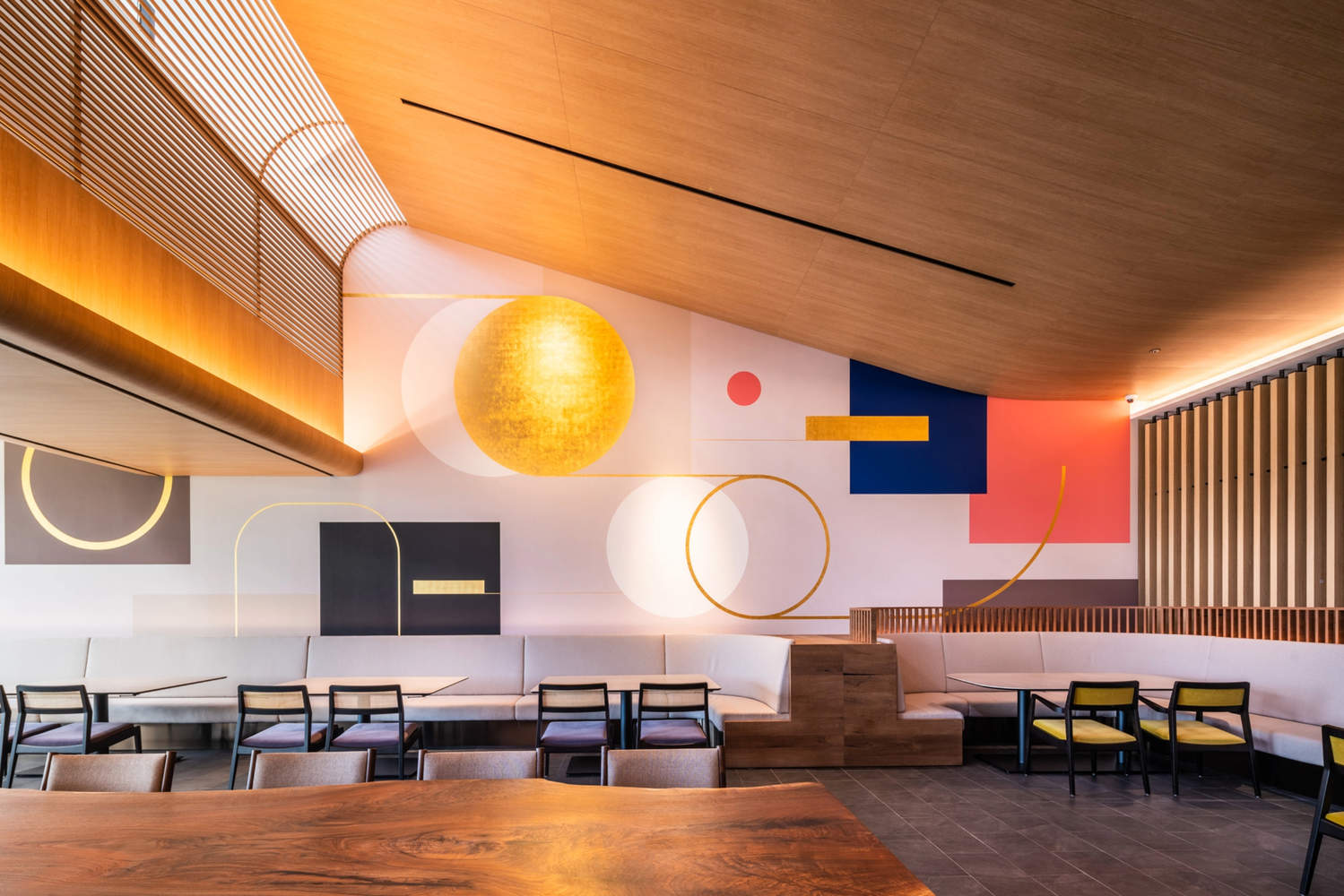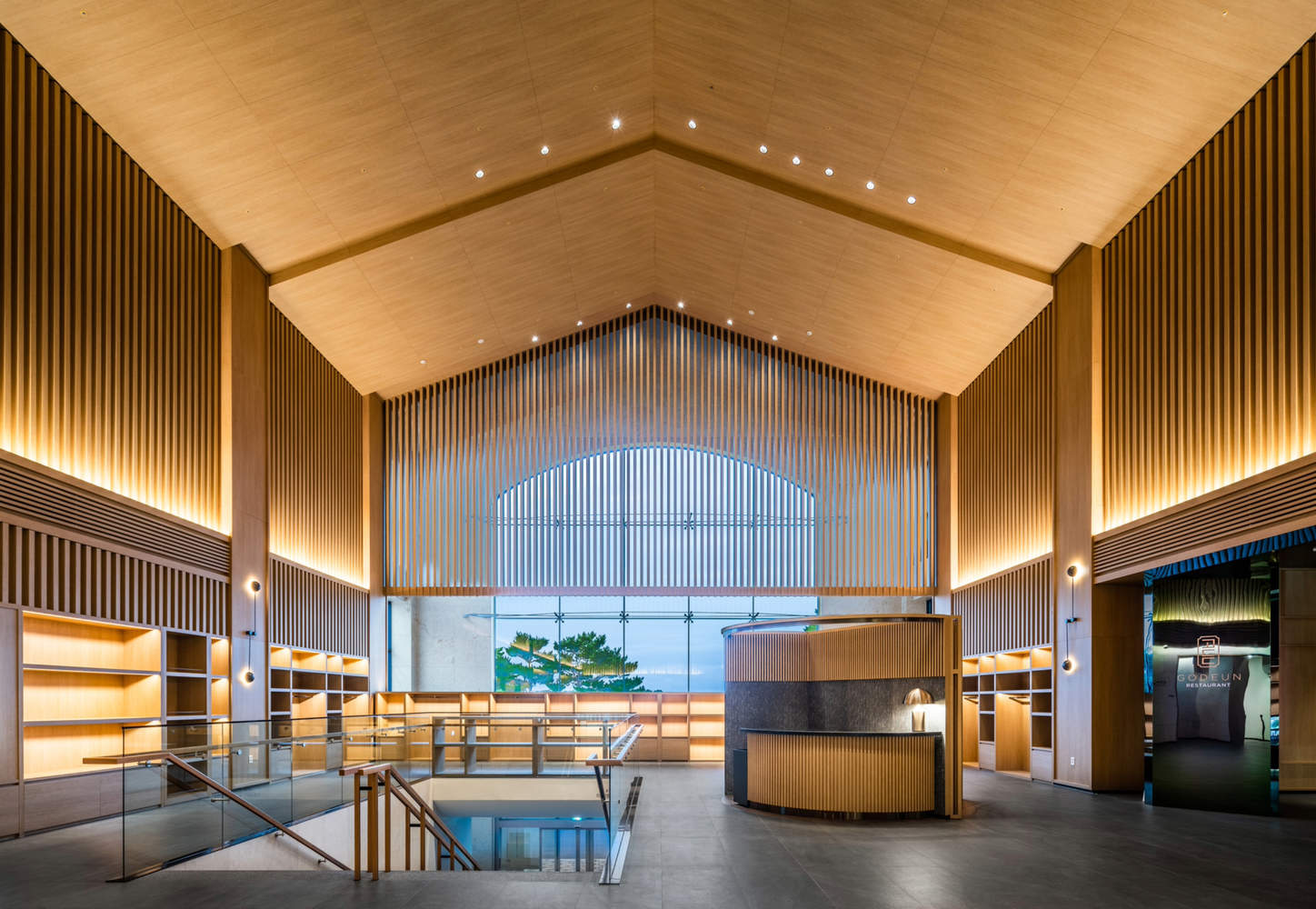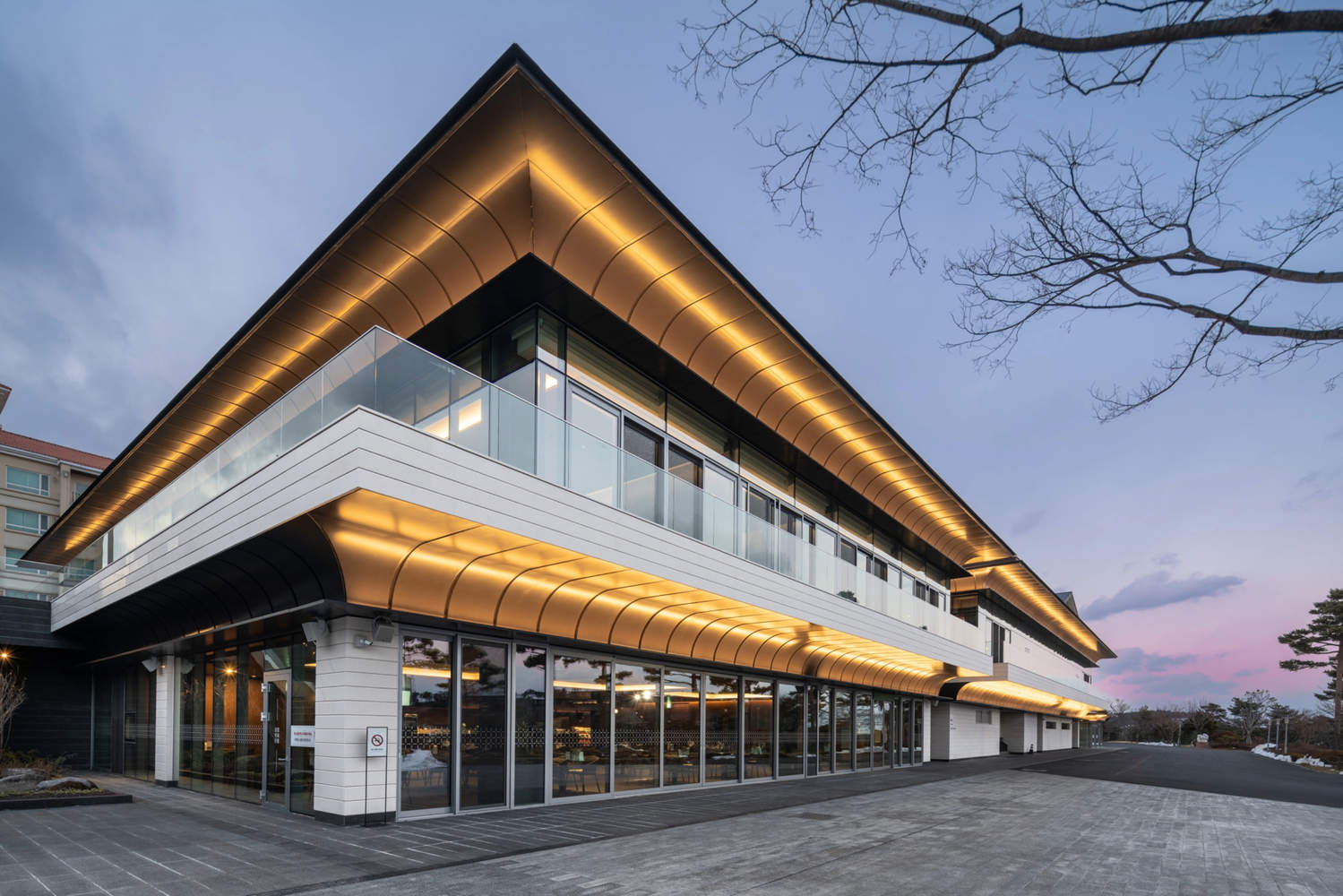 The western facade, where visitors enter the golf course, incorporated wood materials to express warm emotions and dynamic changes, while the eastern facade facing the starter house featured a modern reinterpretation of curved metal eaves. A wooden corridor was installed in the section connecting the clubhouse entrance to the existing Seolhae hot spring and golf-tel, functioning as a new axis for the Seolhaeone master plan along with the canopy.
