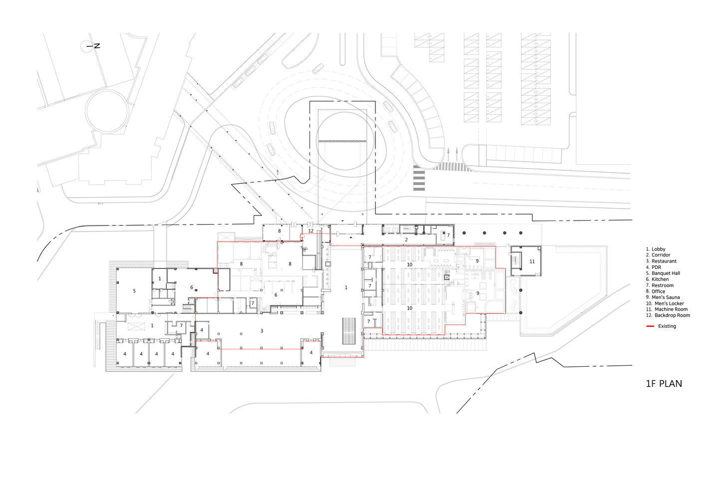 Text description provided by the architects. The expansion of Seolhaeone Clubhouse was initiated to address the need for additional lockers due to golf course expansion, restaurant enhancement, and new cart storage facilities. While it appeared to be a clubhouse remodeling on the surface, it was essentially like re-establishing a master plan that needed to resolve customer flow, management circulation, and parking issues that were problematic in the existing clubhouse, while also reflecting the possibility for expansion according to long-term development plans.