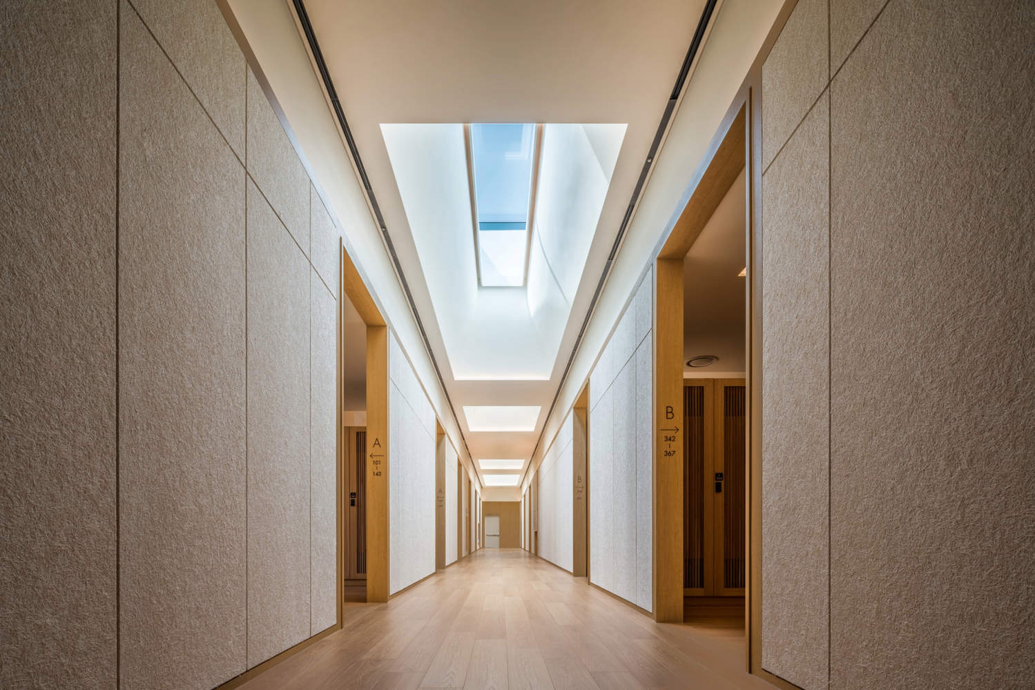 In the main expanded spaces, skylights of varying depths were installed according to the roof height variations, bringing diverse light amplitudes into the interior spaces, and ensuring that the expanded areas maintained a systematic lighting environment with continuity.