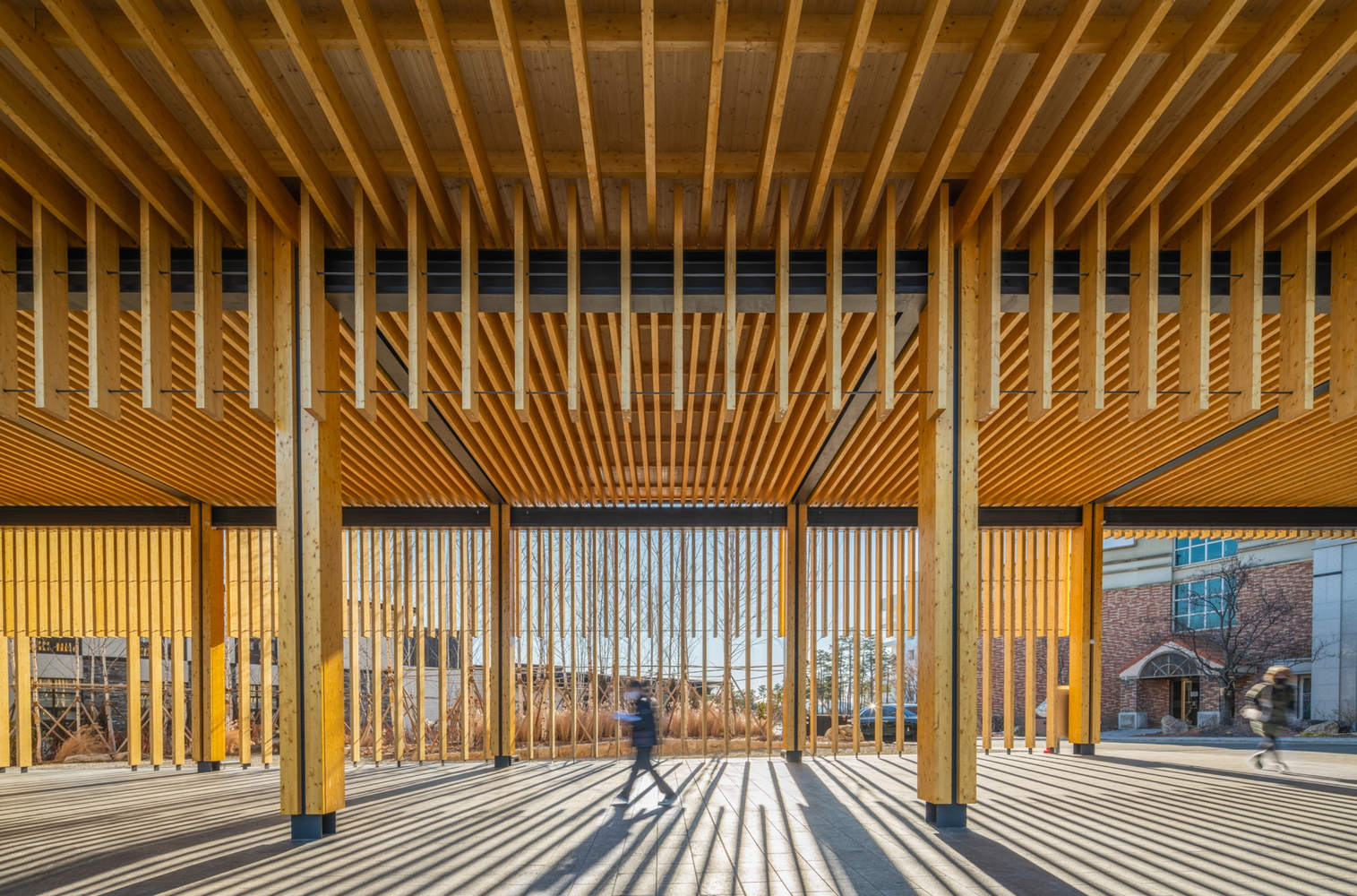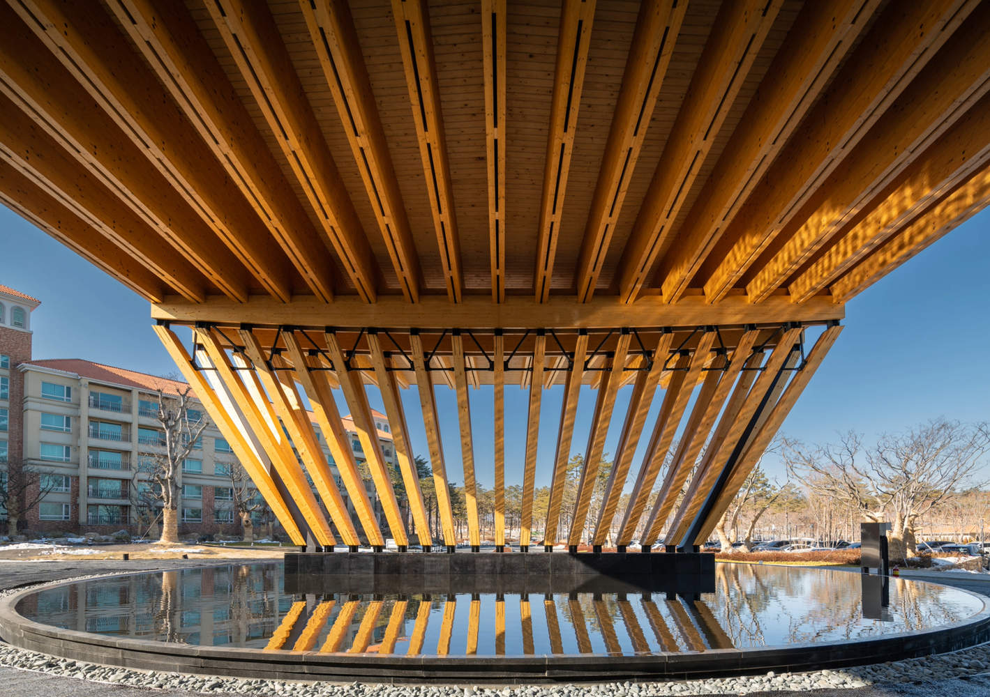 游客进入高尔夫球场的西立面采用了木质材料,以表达温暖的情感和动态变化,而面向主楼的东立面则采用了对弯曲金属屋檐的现代重新诠释。在连接俱乐部会所入口和现有首尔温泉和高尔夫酒店的部分安装了一条木制走廊,与天棚一起作为首尔总体规划的新轴线。
