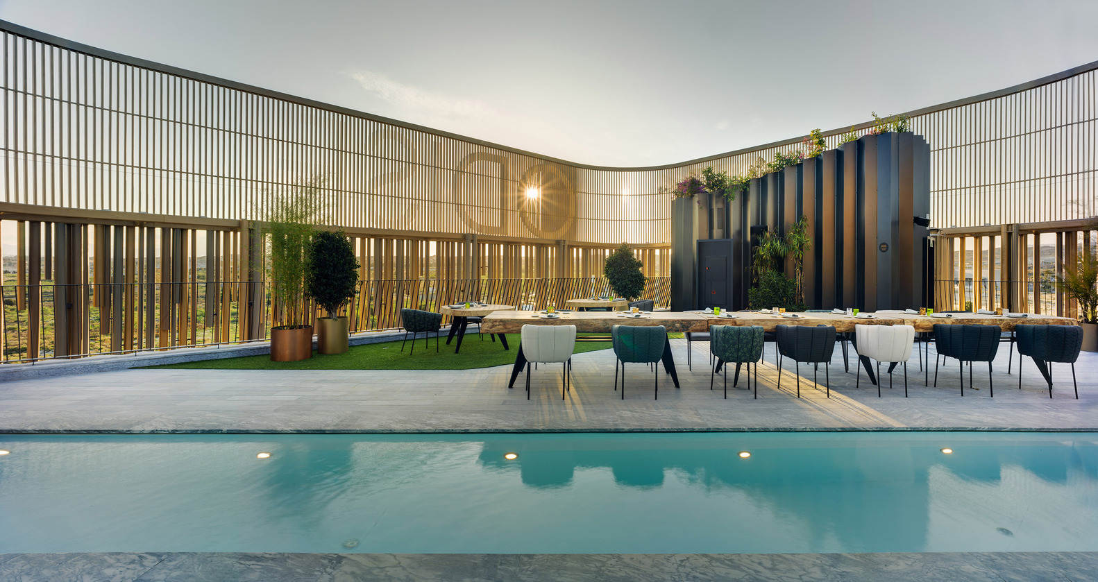 结构创新与生态理念:该项目的精髓在于其结构创新与生态可持续理念的完美结合。悬挑22米的泳池以及“图腾”般的金属管网格结构,展现了设计师对结构力学的精湛掌握。同时,这些结构元素也服务于生态目标,例如高架森林的打造,通过水景、植被、阴凉和通风,营造出独特的微气候,降低了建筑对外部环境的依赖,并为使用者提供了舒适的体验。这种结构与生态的融合,不仅提升了建筑的视觉冲击力,也体现了现代建筑设计对可持续发展和用户体验的重视,赋予了建筑更深层次的生命力。