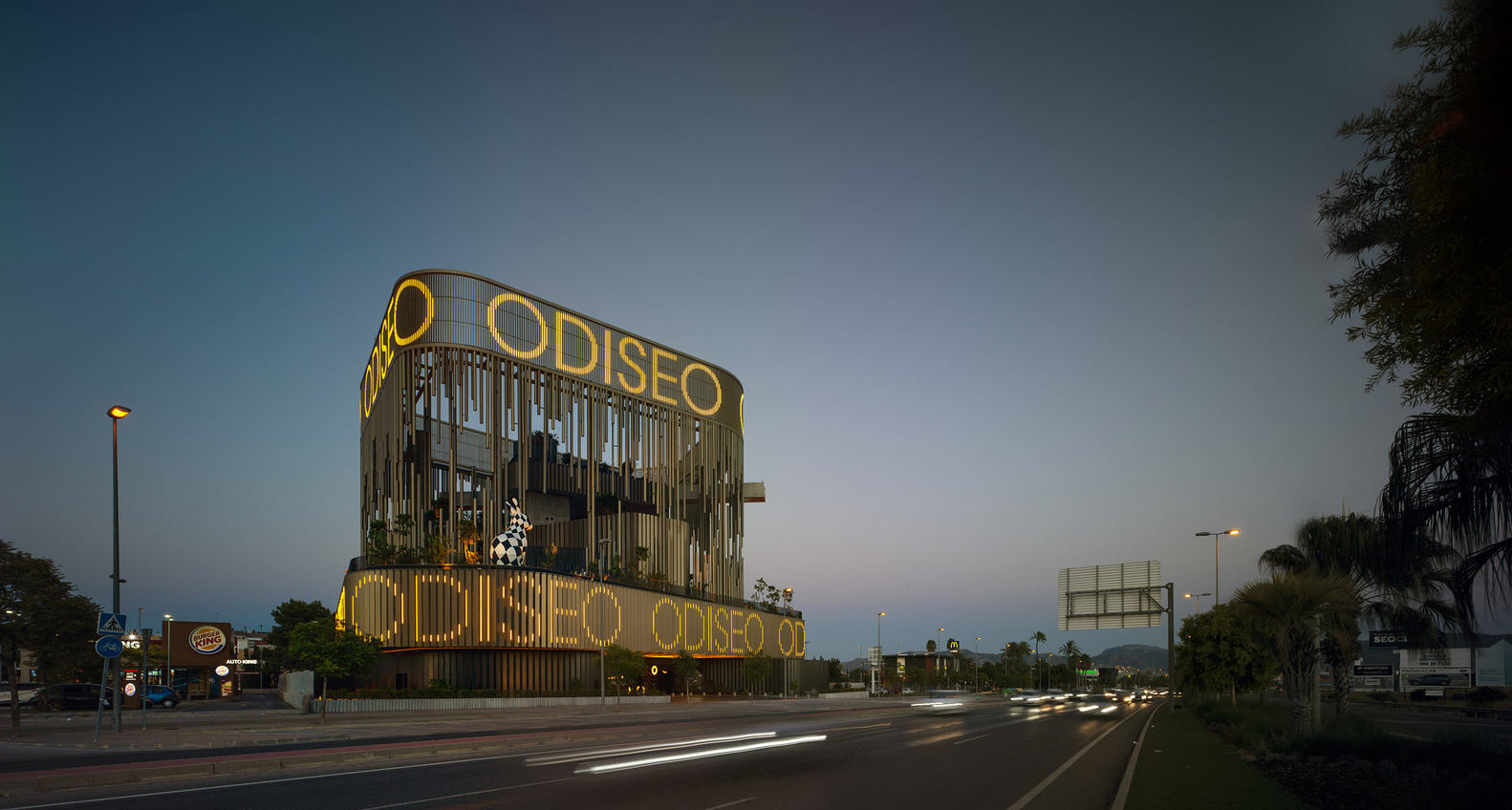 Text description provided by the architects. Odiseo is the result of the desire to create a big urban leisure complex, which wants to become a reference, not only for the city of Murcia, but for the entire southeast region of Spain. Covering a total built area of 15,500 m2, the building houses two restaurants, a nightclub, a performance hall, a casino, and a sports bar, as well as two parking levels underground.