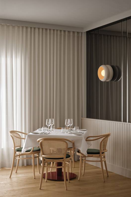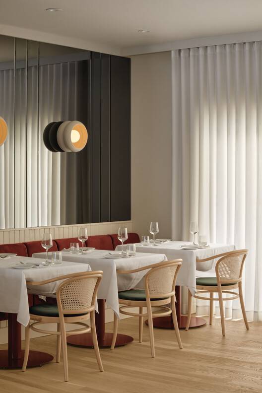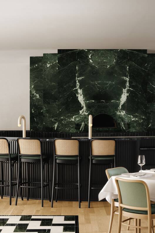 Contributing to the subdued evening atmosphere of the spaces are floor-to-ceiling sheer curtains that cover most of the cream coloured walls. The long wall that follows the main staircase, among others, is covered with a hand made plaster finish, as well as a glossy black ceramic that extends onto the marble pizza oven's base. In front of this said wall hang a limited series of three plaster paintings, designed in collaboration with a local artist specifically for the restaurant.