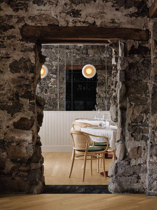 主楼分为三个不同的餐厅,每个餐厅都有自己独特的氛围。酒吧位于原来的石头房子里,提供了一种非常昏暗舒适的氛围。在建筑的更现代的延伸部分是主用餐区,外部开口大大扩大,允许直接通往露台,并为开放空间带来更多的自然光。用槽纹玻璃隔断与这个主要空间隔开的是一个私密的房间,适合更私人的场合。