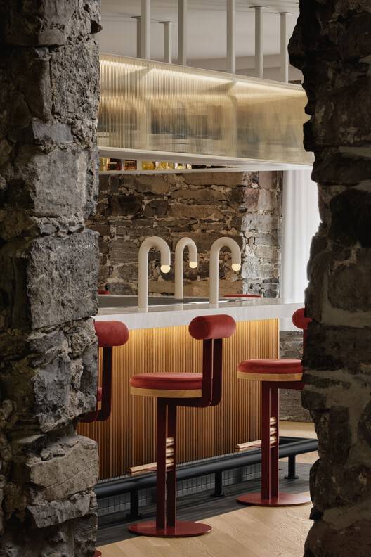 空间中的大部分座位由经典的小酒馆椅子和凳子组成,颜色和材料各不相同。酒吧里有定制设计的凳子,由散布在餐厅各处的钢、木和天鹅绒制成。